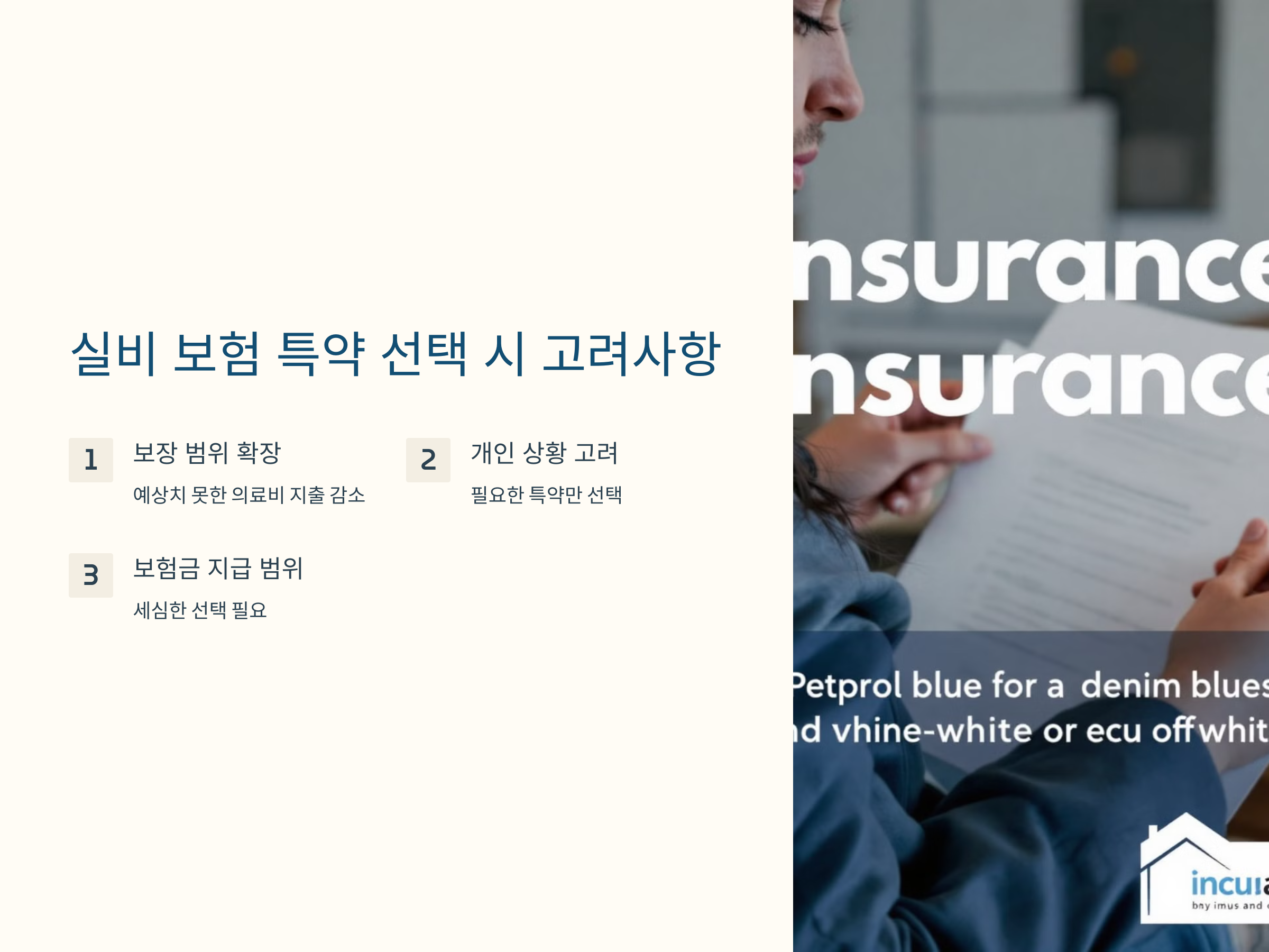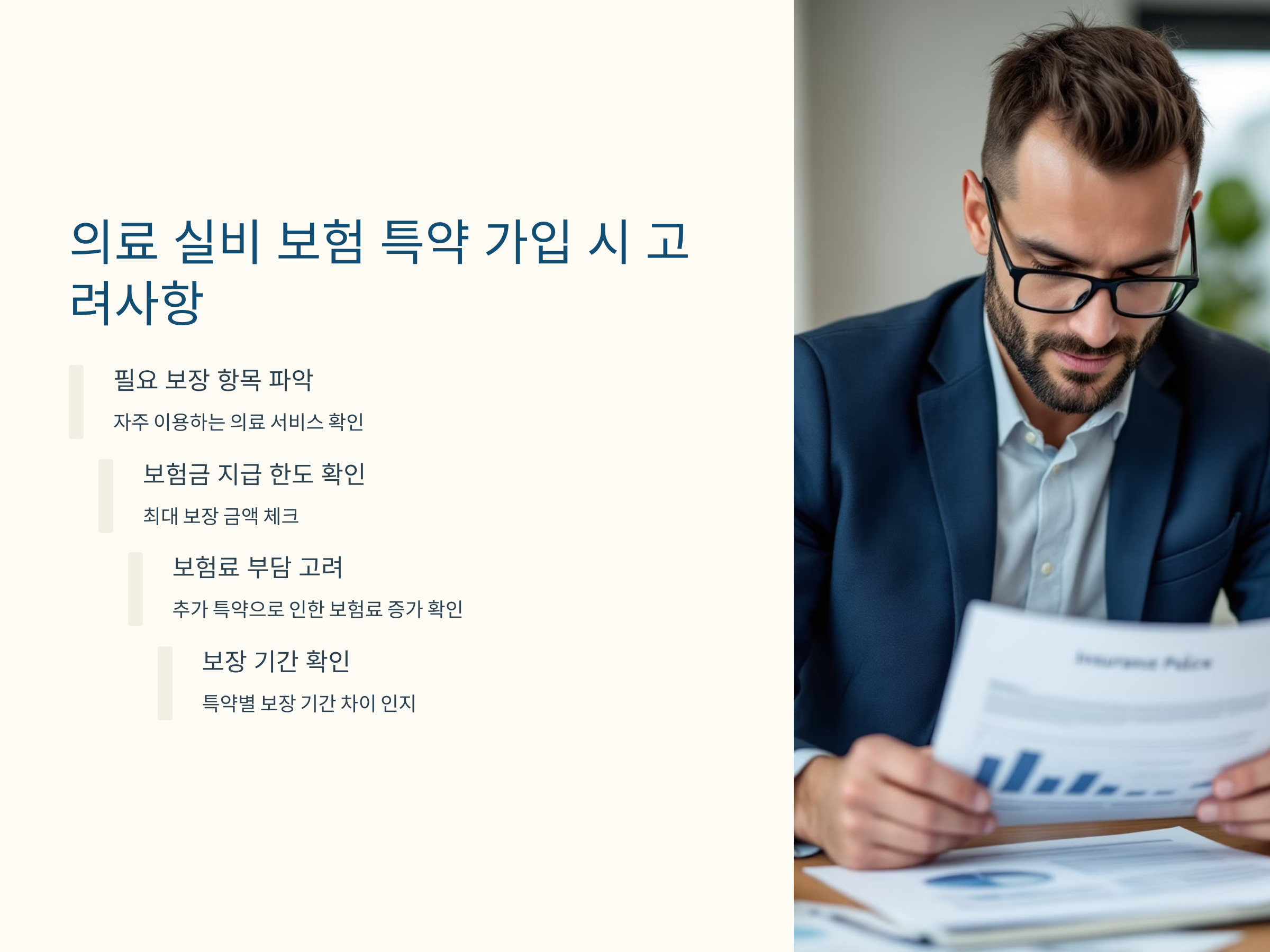 의료 실비 보험 특약을 선택할 때 유의해야 할 사항들을 정리해보겠습니다. 이를 통해 보다 현명하게 보험을 선택할 수 있습니다.