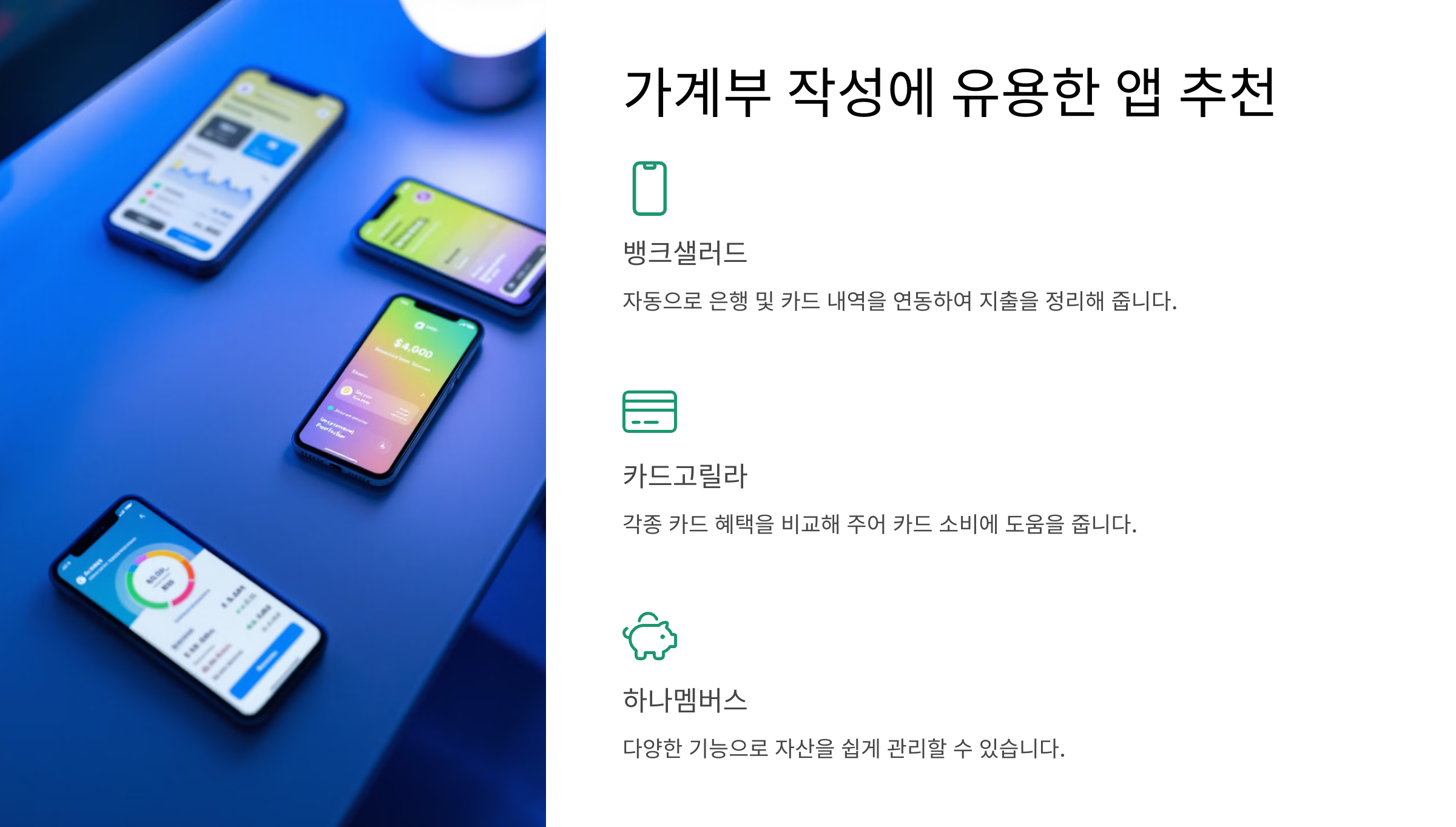 - 자산관리 앱 '카드고릴라': 각종 카드 혜택을 비교해 주어 카드 소비에 도움을 줍니다.