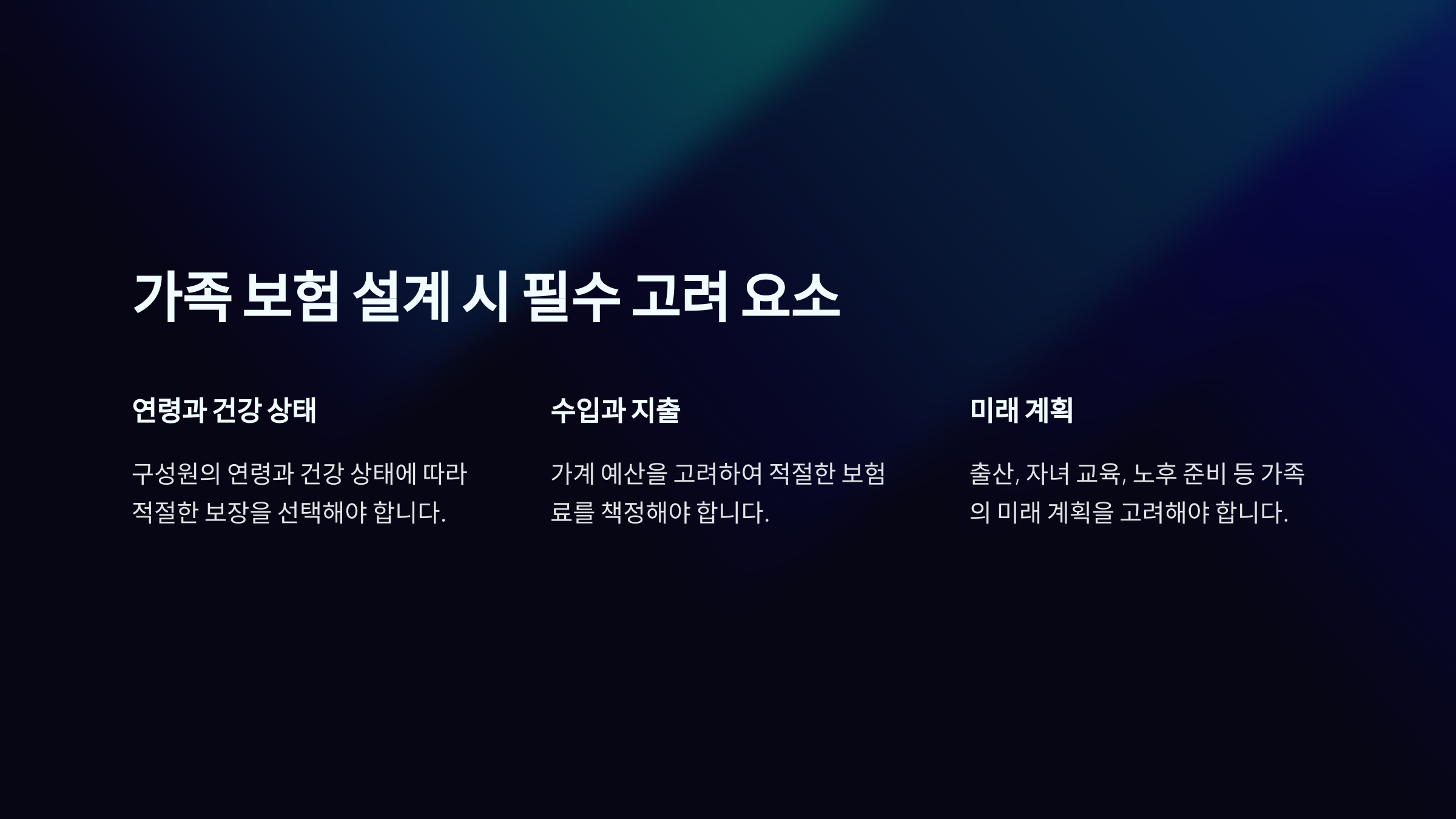 가족 보험 설계 시에는 다음과 같은 요소를 꼭 고려해야 합니다.