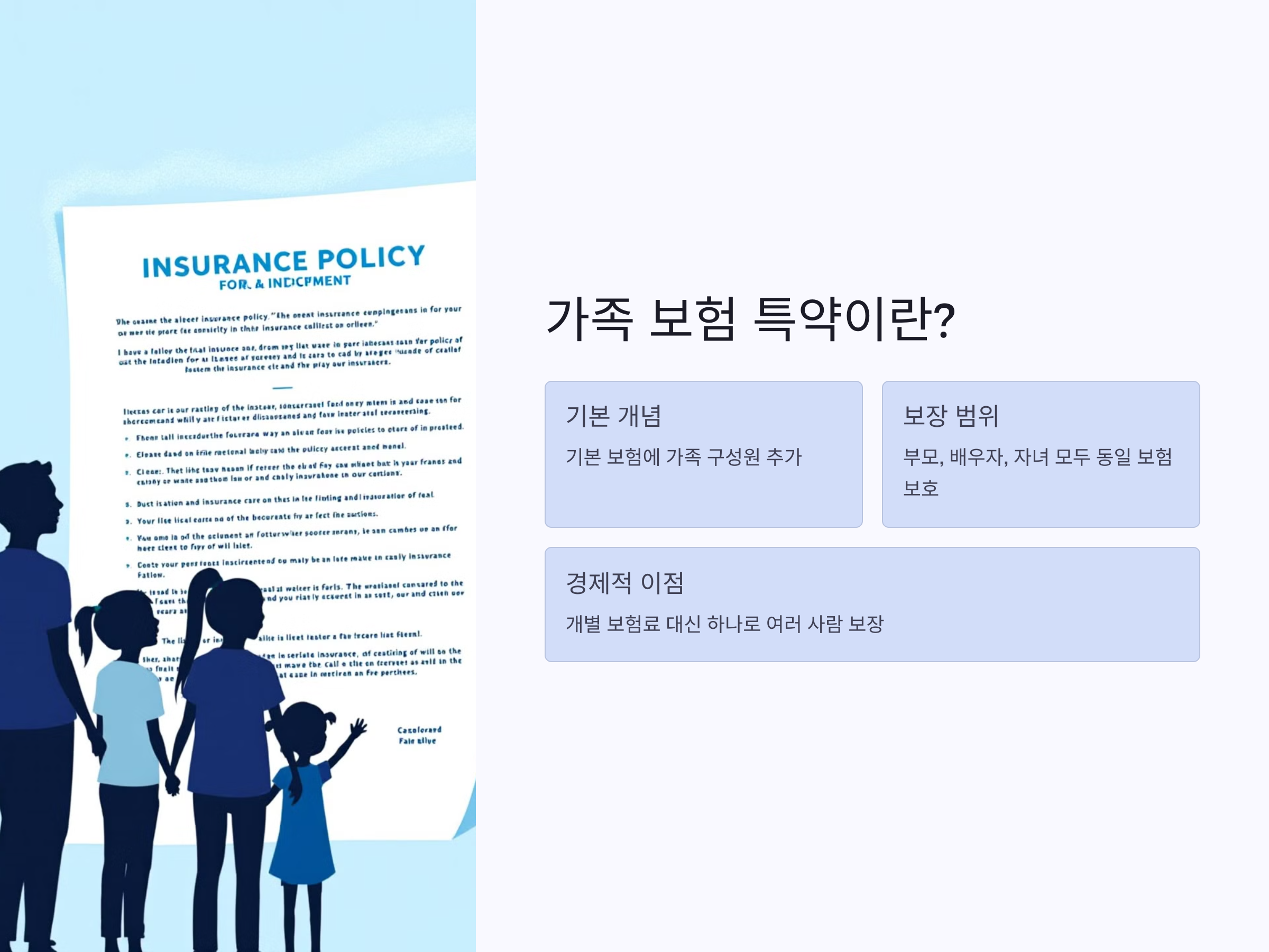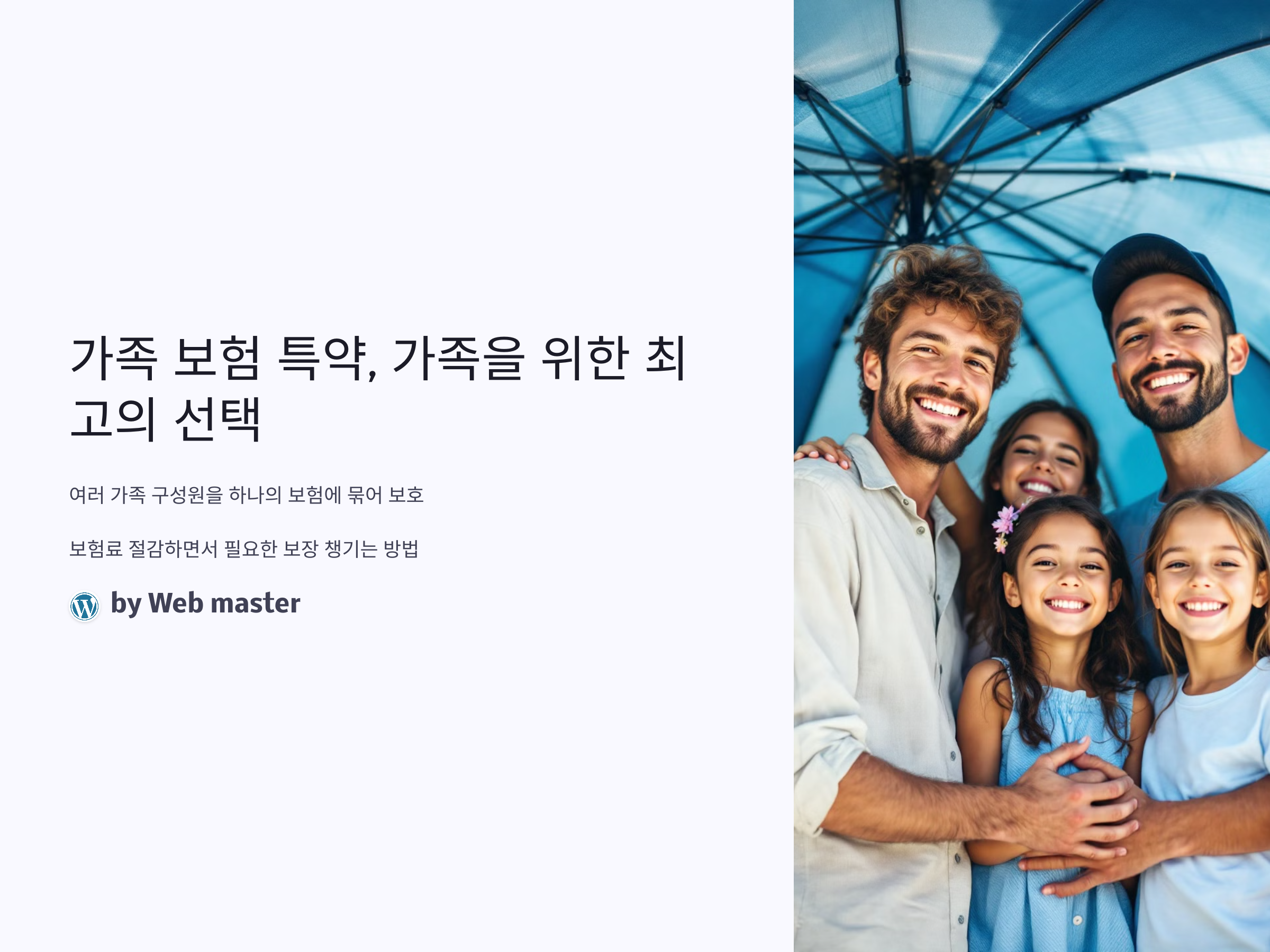 가족 보험 특약은 여러 가지 장점이 있습니다. 가장 큰 장점은 보험료 절감입니다. 가족 전체가 하나의 보험을 공유하기 때문에, 개별적으로 가입하는 것보다 더 저렴한 보험료로 여러 명을 보장할 수 있습니다. 또한, 보험 계약을 하나로 묶으므로, 보험 관리가 편리해지고, 보장 내용에 대한 통합된 관리가 가능합니다.