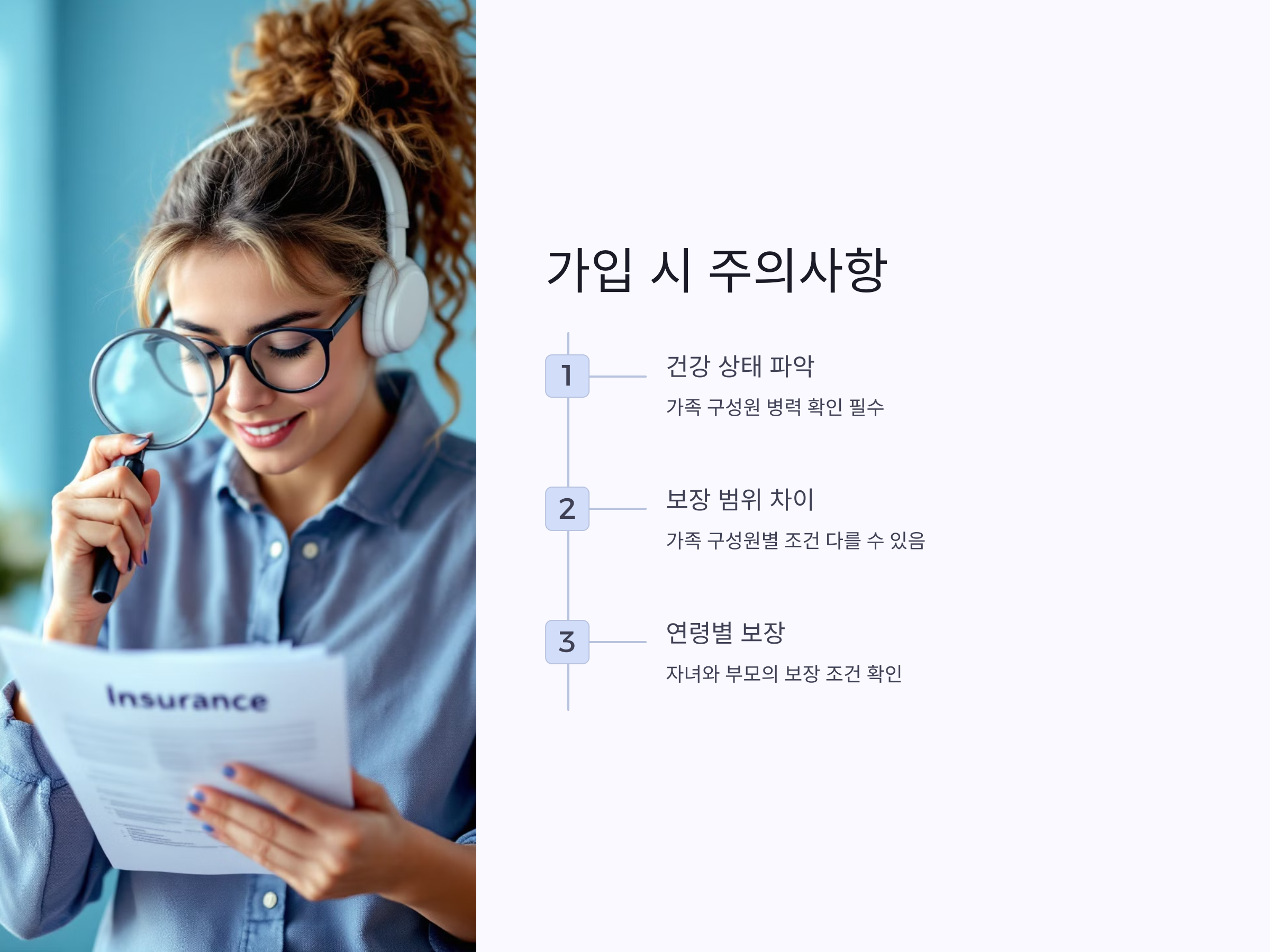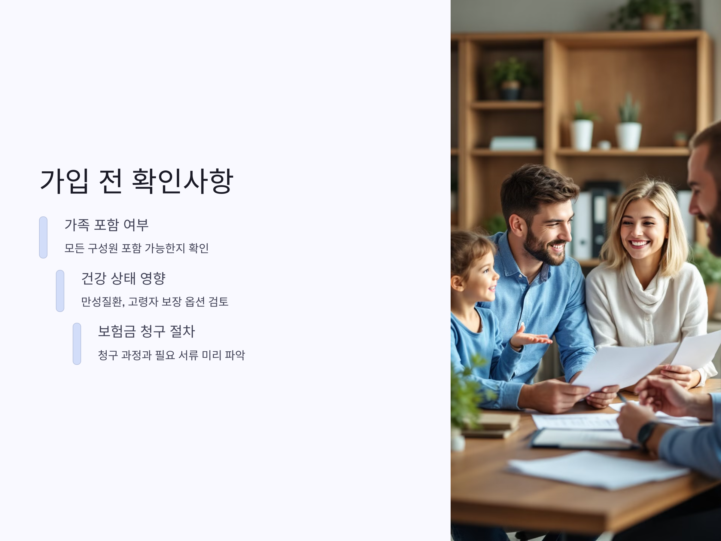 둘째로, 보험금 청구 시의 절차와 조건을 잘 파악해야 합니다. 여러 가족 구성원이 동일한 보험에 가입되어 있기 때문에, 보험금 청구 과정에서 불편함이 없도록 미리 확인해두는 것이 중요합니다. 보험사마다 청구 절차나 필요한 서류가 다를 수 있기 때문에, 이를 정확히 알고 준비하는 것이 좋습니다.