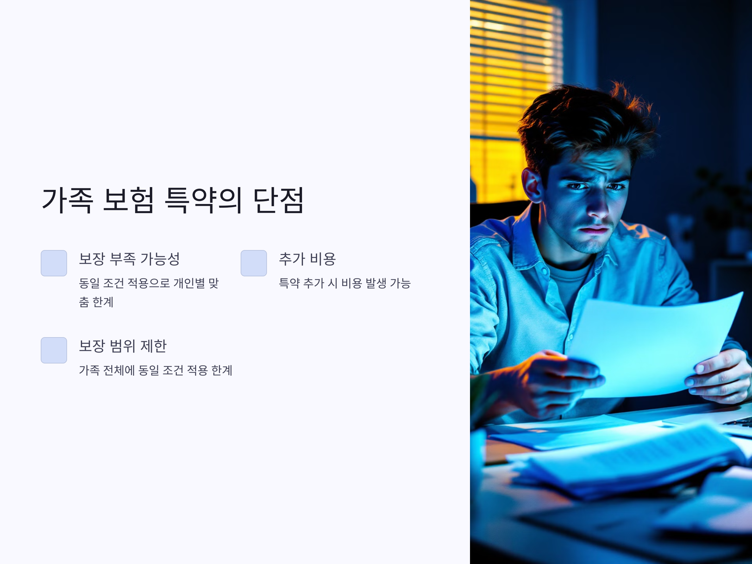 가족 보험 특약에는 몇 가지 단점도 존재합니다. 가장 큰 단점은, 특약 가입 후 보장이 부족하거나 필요한 부분이 빠질 가능성이 있다는 점입니다. 보험 상품을 하나로 묶다 보니, 가족 구성원 모두가 동일한 조건을 적용받게 되는데, 각자의 상황에 맞는 보장을 따로따로 설정할 수 없다는 한계가 있을 수 있습니다.