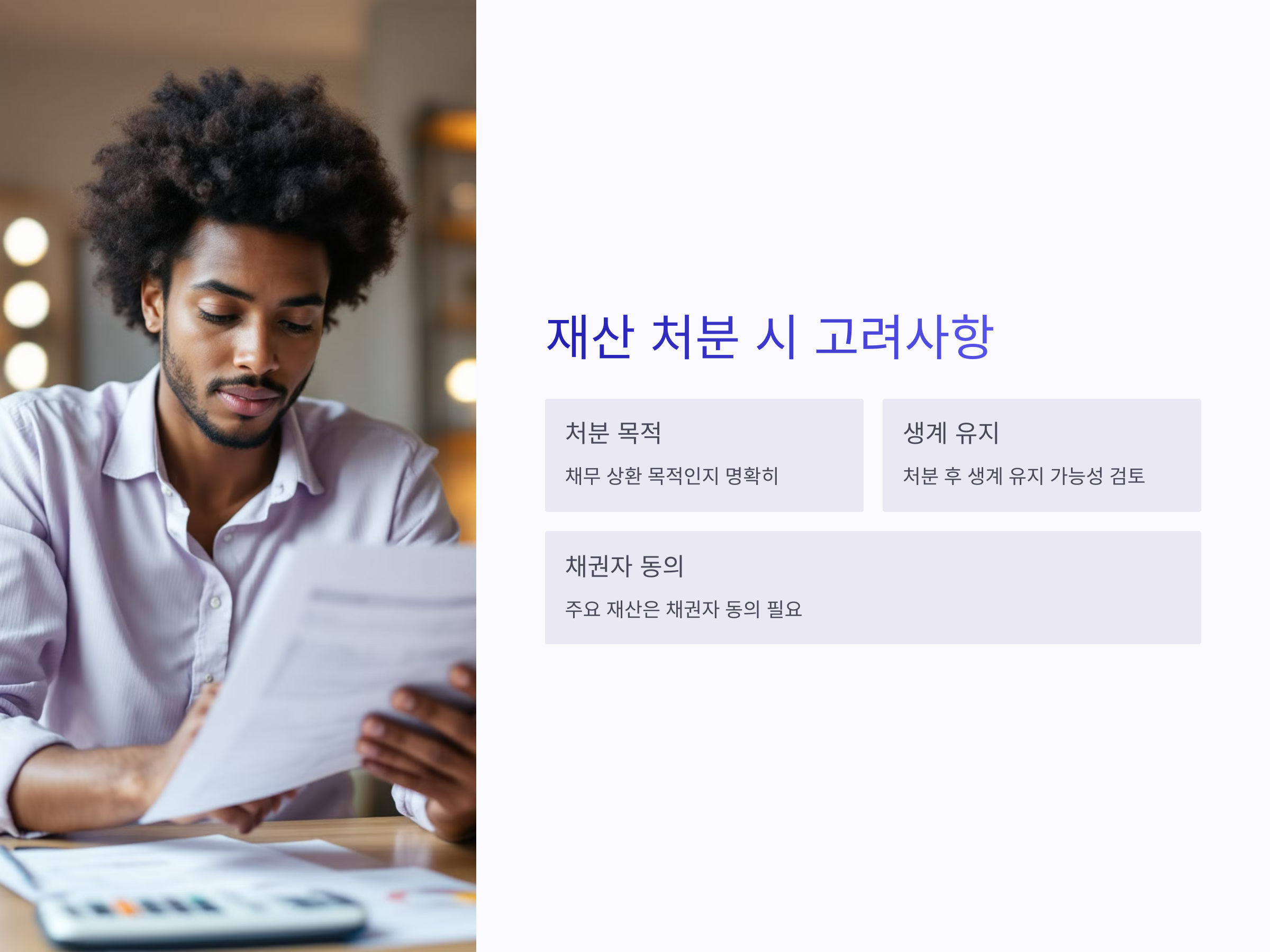 - 채무 조정 조건 변경: 처분 대금의 사용 목적에 따라 채무 조정 조건이 변경될 수 있습니다.