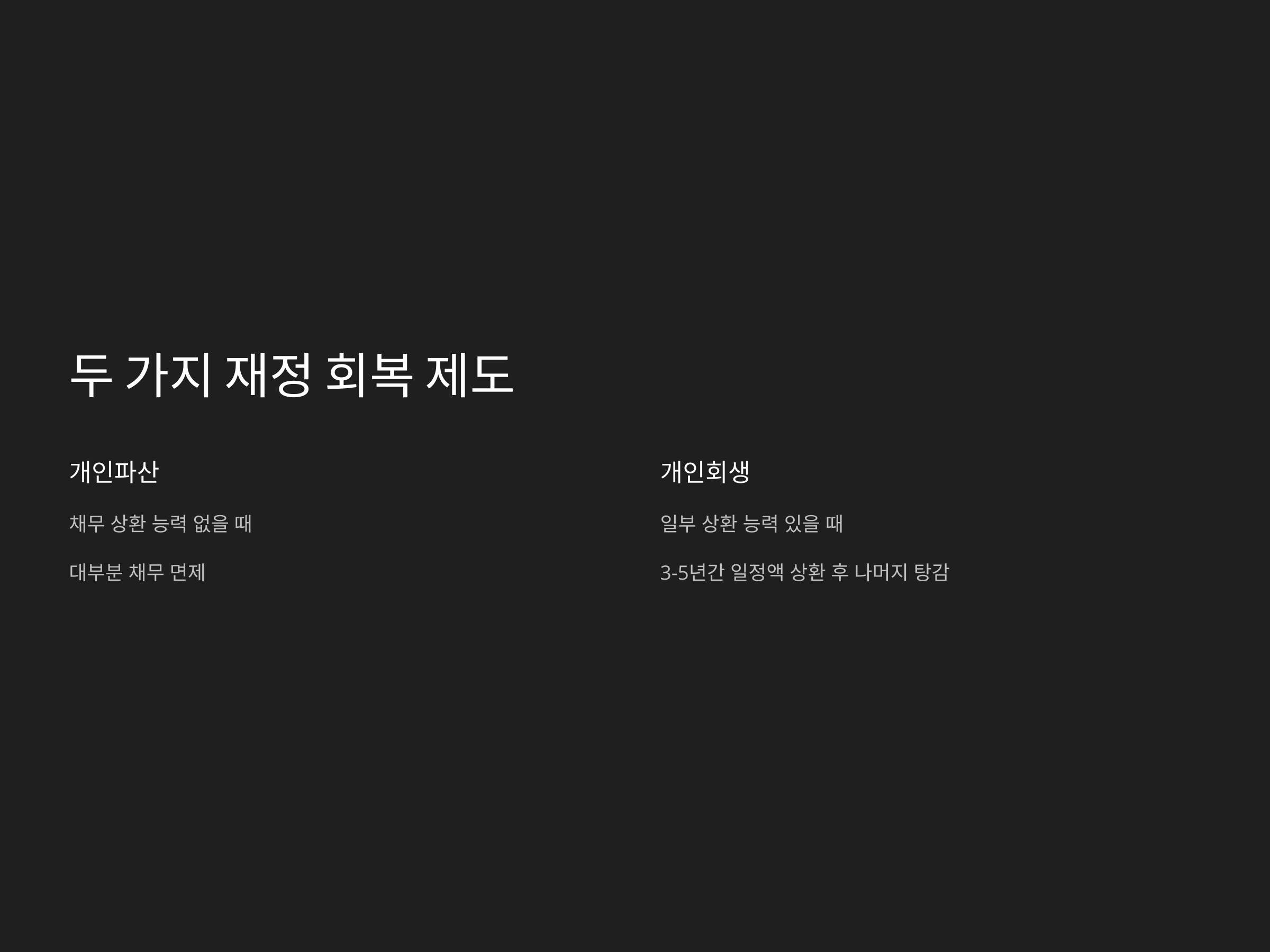 - 개인파산: 대부분의 채무가 면제됩니다.