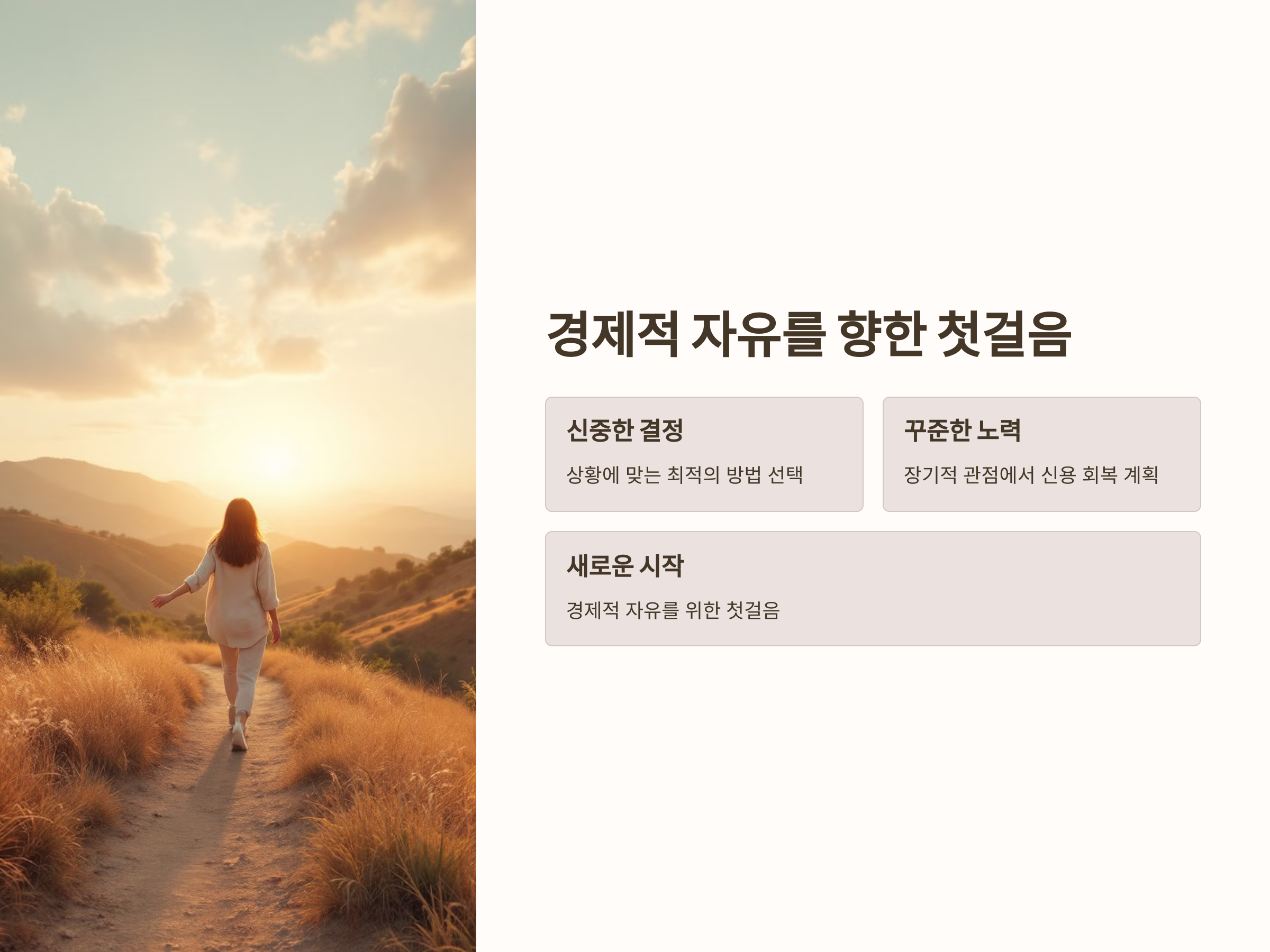 두 방법 모두 각각의 장점과 단점이 있으므로, 자신의 재정 상황과 향후 계획을 고려하여 최선의 선택을 하는 것이 중요합니다. 신용 회복의 첫걸음을 내딛고, 더 나은 경제적 자유를 향해 나아가는 것이 중요합니다.