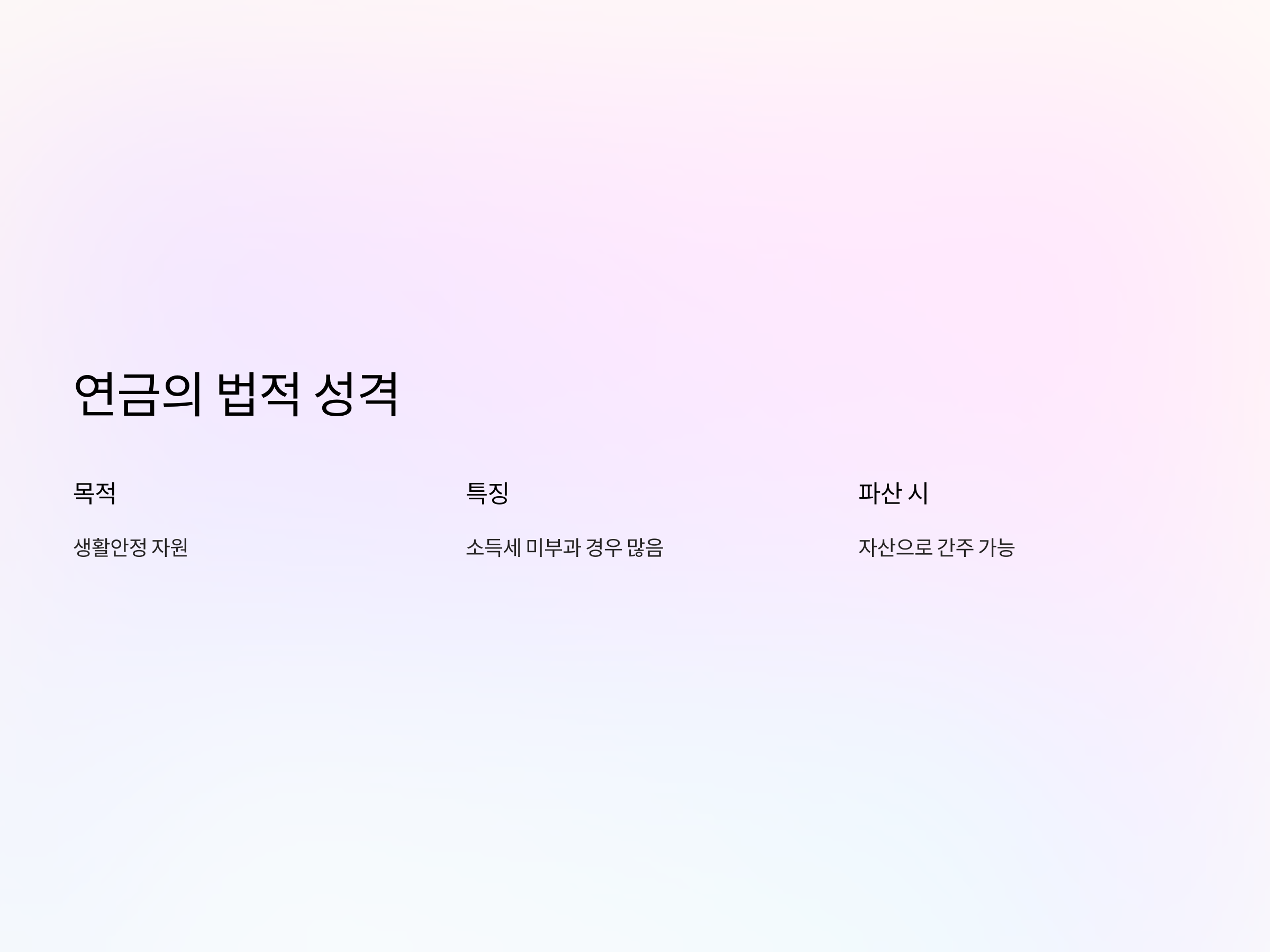 - 국민연금: 국민연금은 기본적으로 생활보장을 위한 성격이 강하며, 대부분의 경우 면책재산으로 인정되지 않습니다. 즉, 연금 수령액이 일정 수준을 초과하면 파산재산에 포함될 수 있습니다.