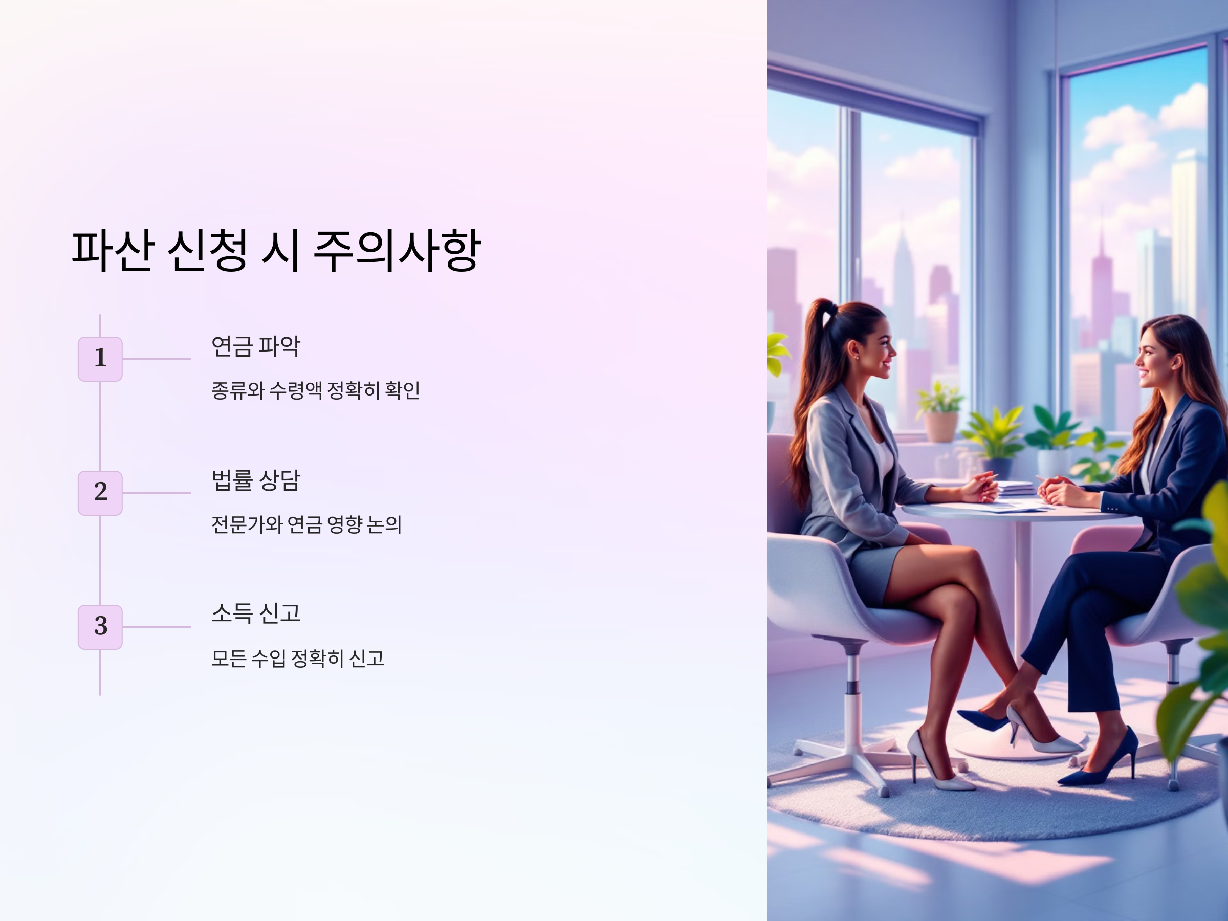 연금을 받는 사람은 개인파산을 신청하기 전, 반드시 법률 전문가와 상담하여 자신의 연금이 어떤 영향을 받을지 파악하고, 연금의 보호 여부를 확인해야 합니다. 또한, 파산 신청 후 소득 신고 시 연금을 포함한 모든 수입을 정확하게 신고해야 하며, 이를 누락하거나 허위로 신고할 경우 법적인 불이익을 받을 수 있습니다.
