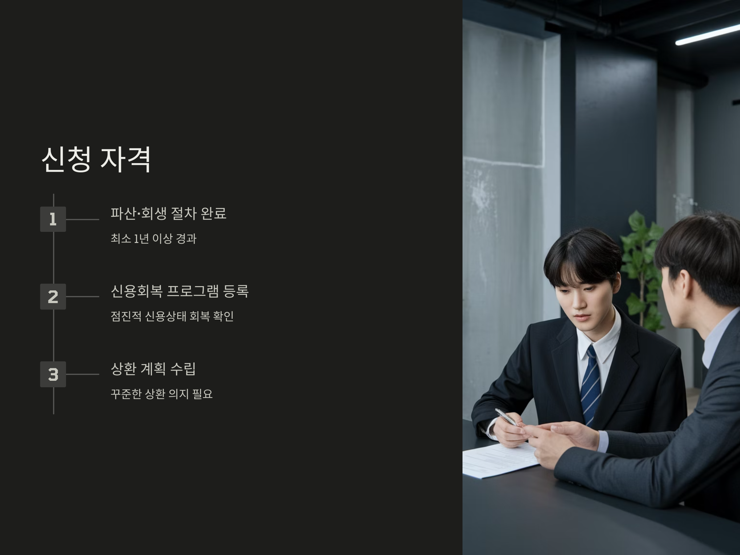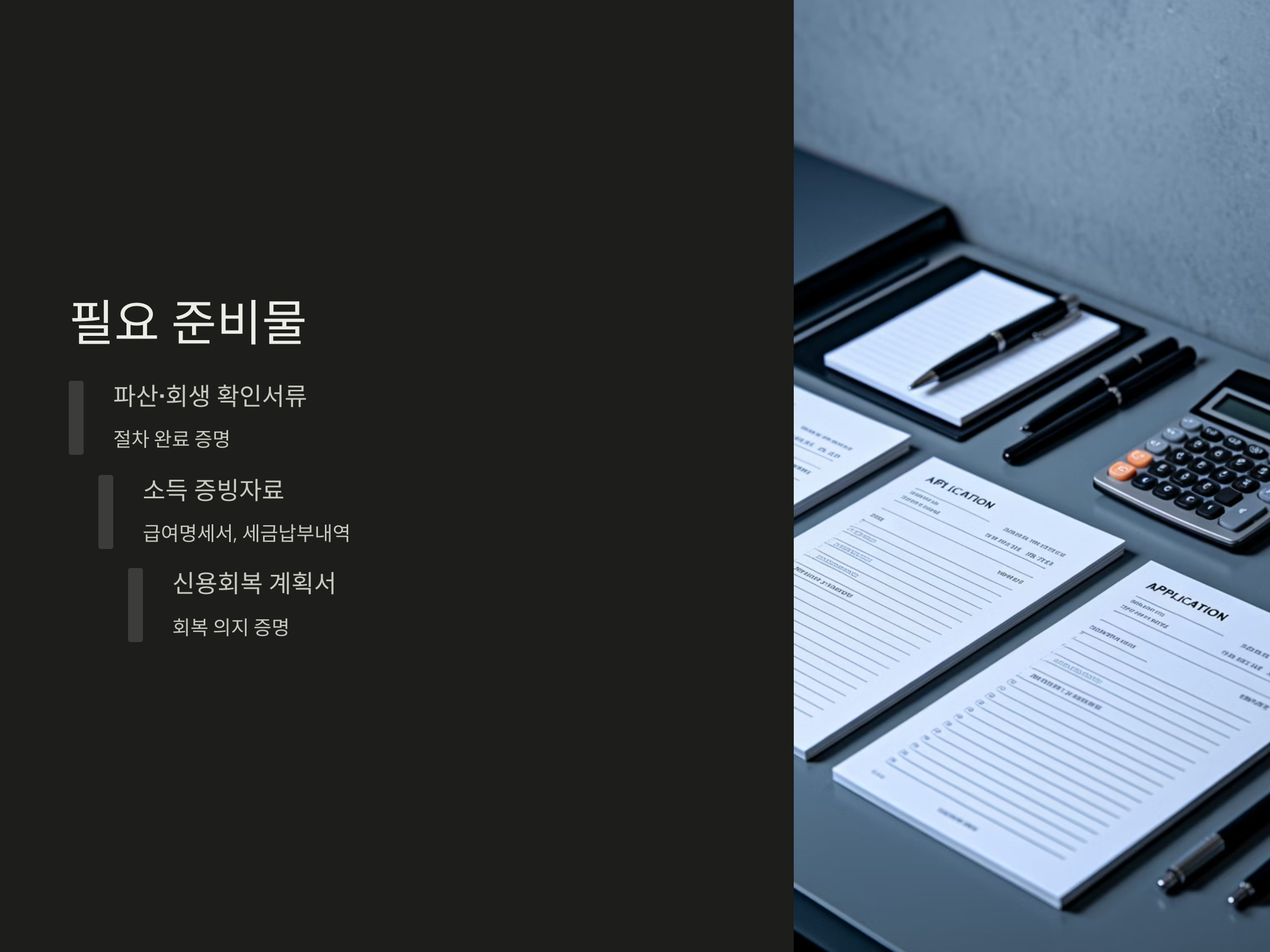 개인파산자대출을 신청하기 위해서는 몇 가지 자격 요건을 충족해야 합니다. 첫째, 개인파산이나 개인회생 절차를 마친 후 일정 기간이 경과한 사람이어야 합니다. 대부분의 대출 기관은 최소 1년 이상이 경과한 후 대출 신청을 허용합니다. 둘째, 신용 회복 프로그램에 등록된 사람이면 대출을 신청할 수 있습니다. 이를 통해 채무자의 신용 상태가 점진적으로 회복되는지 확인할 수 있습니다.