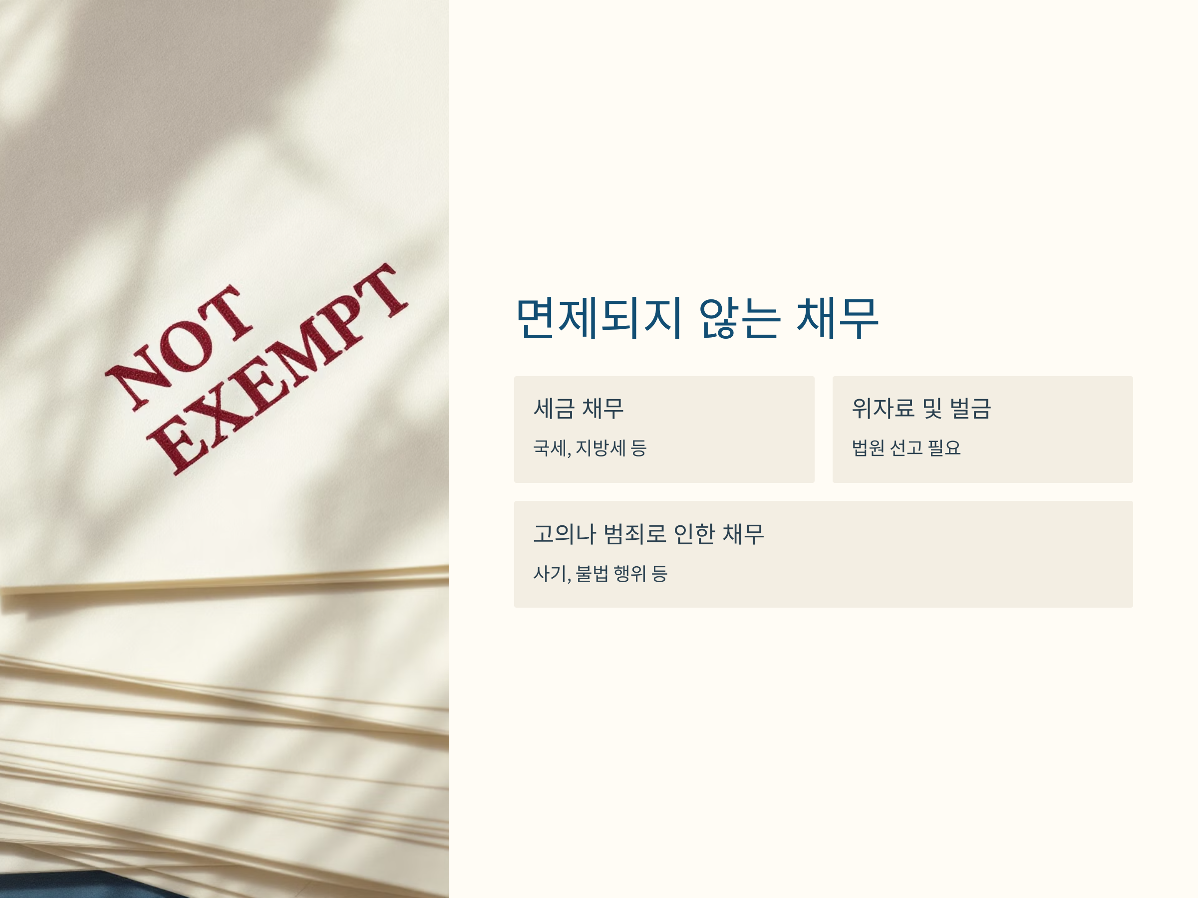 - 세금 채무: 국세, 지방세 등 세금 관련 채무는 면제되지 않습니다.