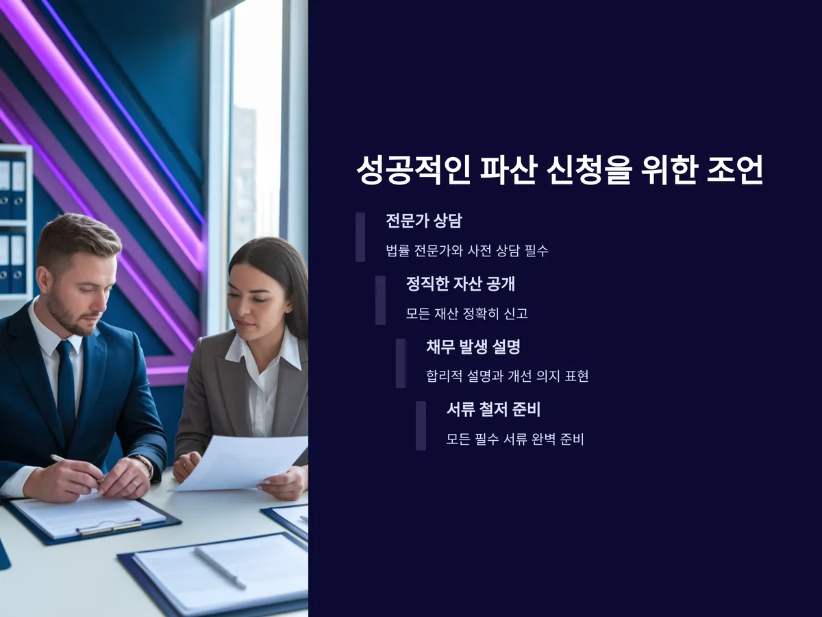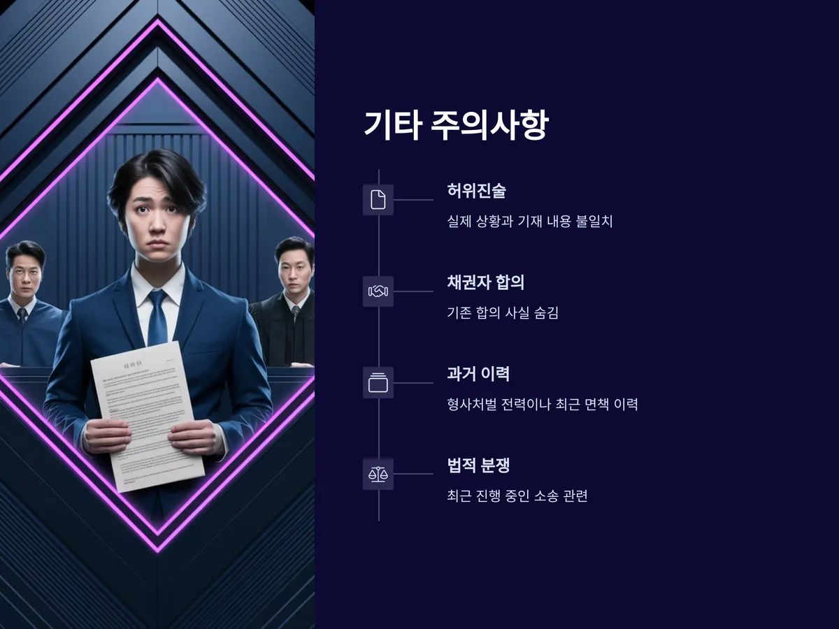 파산신청서에 기재된 사실과 실제 상황이 상이한 경우, 가족 부양 내역이 누락되었거나 허위진술이 있는 경우도 기각사유가 됩니다. 또한, 이미 채권자들과 합의 중인 사실을 숨기거나, 최근 법적 분쟁이 있었던 경우에도 불이익을 받을 수 있습니다.