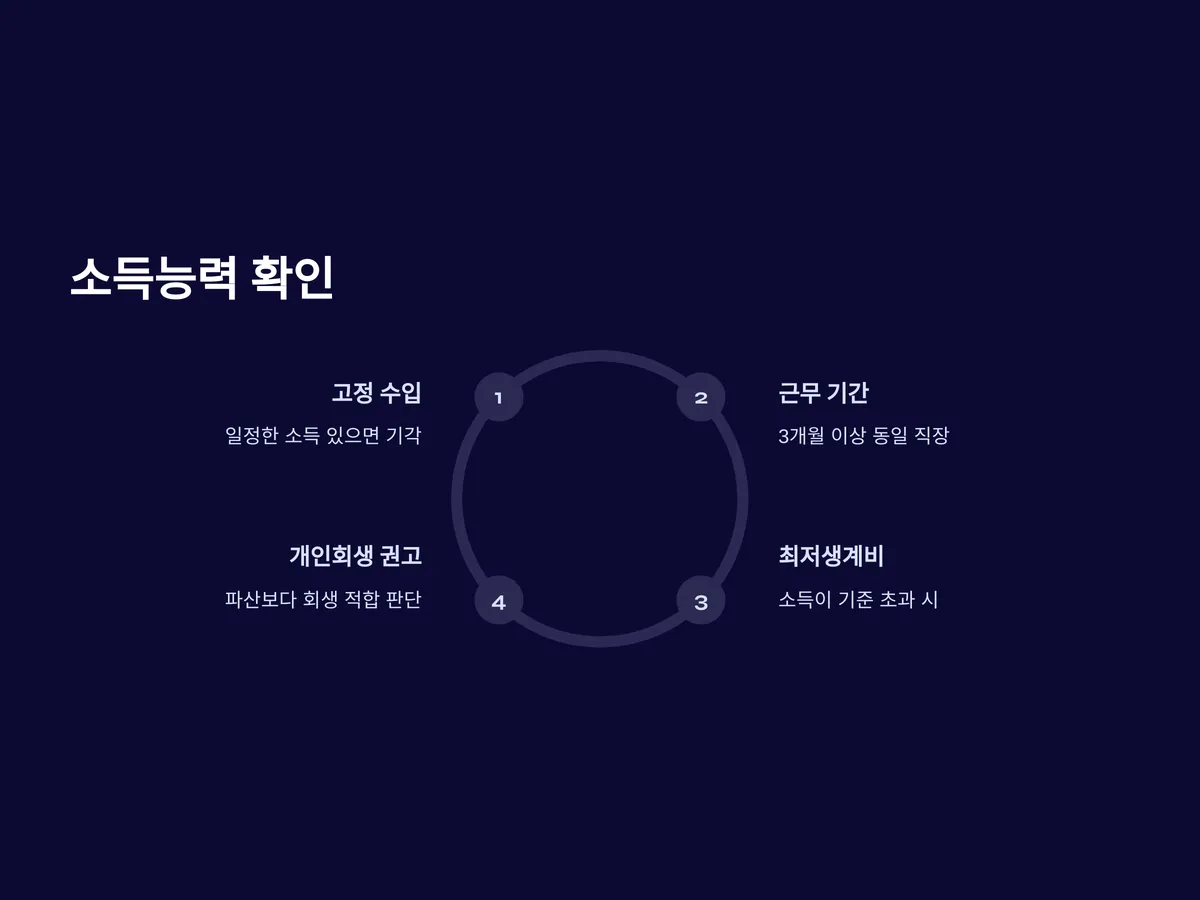 파산은 말 그대로 상환 불능 상태에 있어야 인정됩니다. 따라서 일정한 고정 수입이 있거나, 향후 소득 발생 가능성이 명확한 경우에는 법원에서 기각을 내릴 수 있습니다. 특히 3개월 이상 동일 직장에서 근무 중이거나, 소득이 최저생계비를 상회하는 경우는 ‘파산보다는 개인회생’이 적합하다는 판단을 받기 쉽습니다.