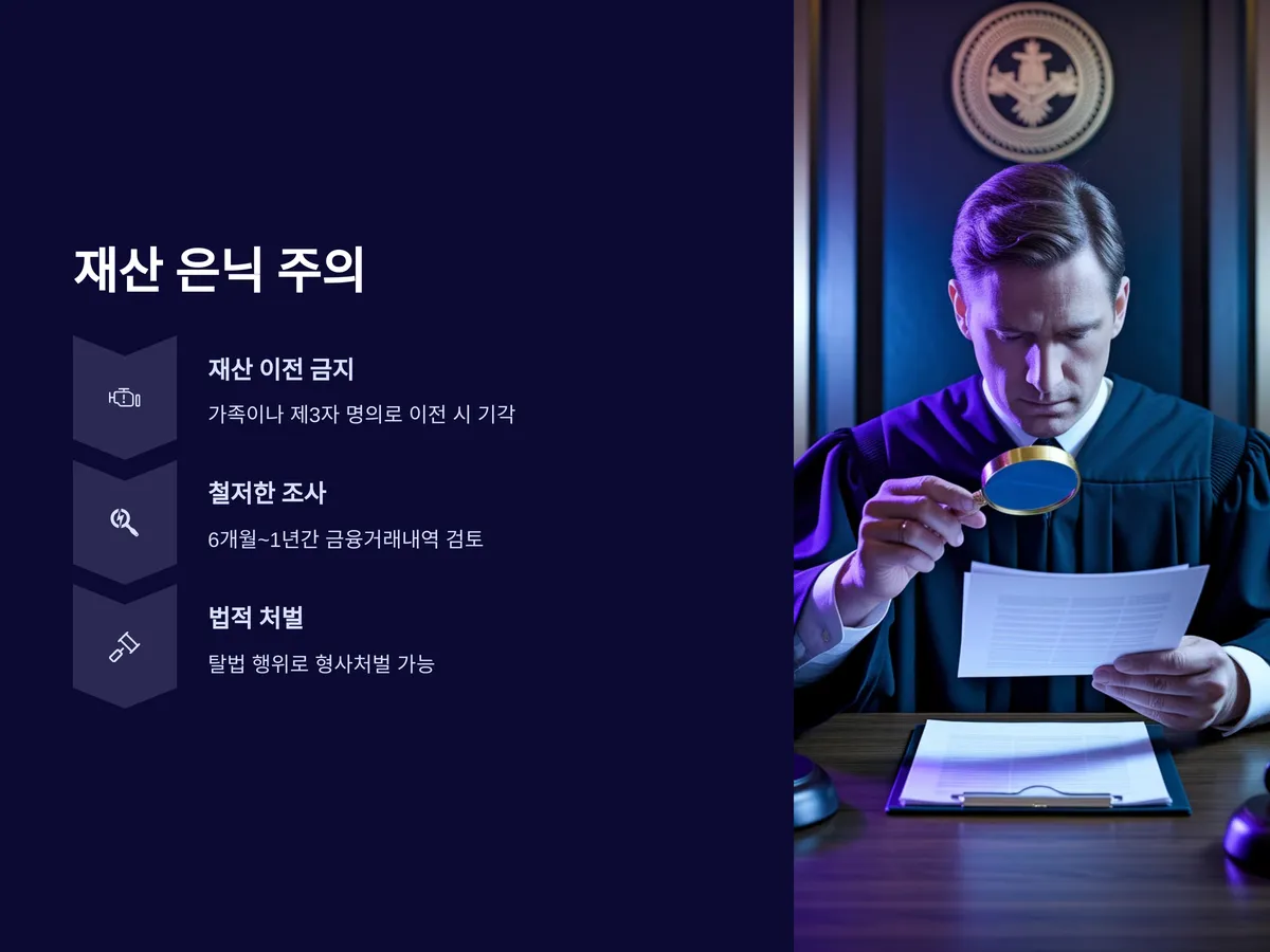 법원은 신청 전 6개월~1년간의 금융거래내역, 부동산 처분기록, 차량 명의 이전 등까지 면밀히 조사합니다. 따라서 모든 자산은 있는 그대로 신고하고, 정당한 이유 없는 은닉이 발견될 경우 신청 전체가 무효 처리될 수 있습니다. 사전 상담이나 전문가의 도움 없이 독단적으로 진행할 경우 특히 위험합니다.