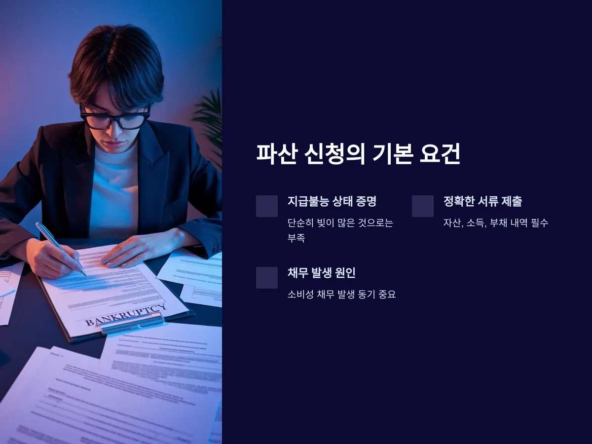 개인파산 신청 시에는 단순히 빚이 많다는 이유만으로는 부족합니다. 법원은 신청인이 더 이상 재산으로 채무를 상환할 수 없는 ‘지급불능 상태’임을 증명해야 합니다. 이를 위해 자산 내역, 소득 흐름, 부채 내역 등을 정확하게 제출해야 하며, 제출 서류가 부정확하거나 누락될 경우 기각 사유로 작용할 수 있습니다.