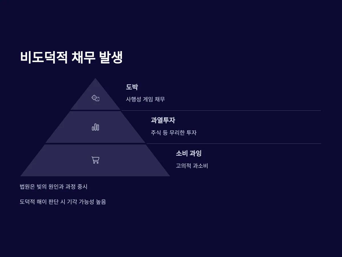 또한, 현재 채무가 얼마나 심각한지뿐만 아니라 그 채무가 어떻게 발생했는지도 중요한 판단 요소입니다. 소비성 채무가 많은 경우, 채무 발생의 동기나 이후 태도에 따라 결과가 달라질 수 있습니다. 예를 들어 도박이나 사행성 투자로 인한 채무라면 기각 가능성이 높아집니다.