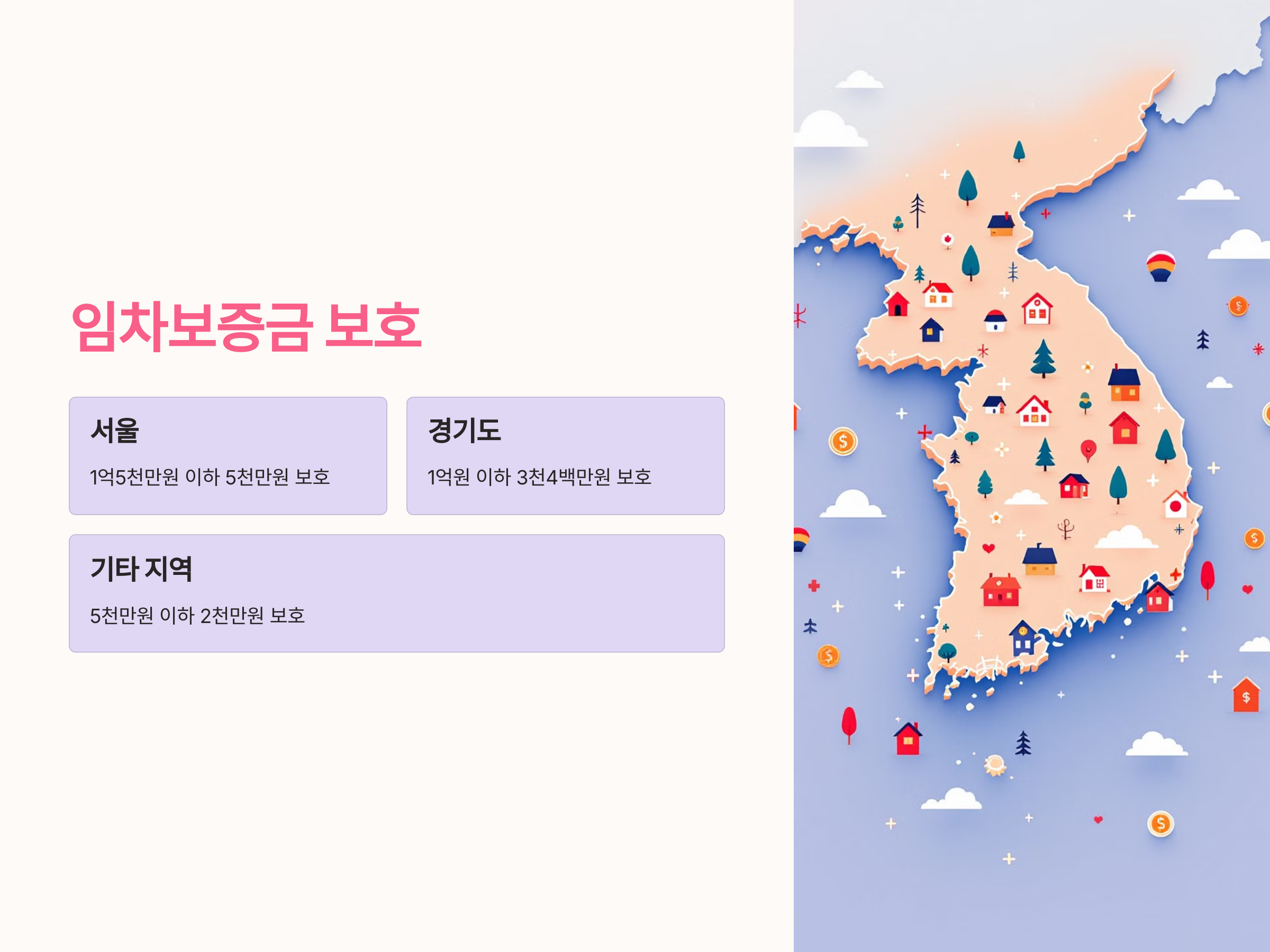 - 기타 지역: 보증금 5천만 원 이하일 때 2천만 원까지 보호.