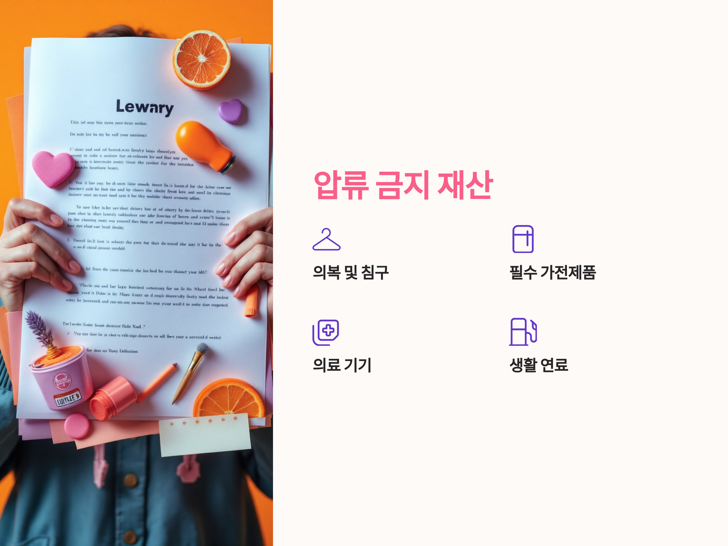 - 생활 필수품: 의복, 침구, 기본 가구 등 일상생활에 꼭 필요한 물품.