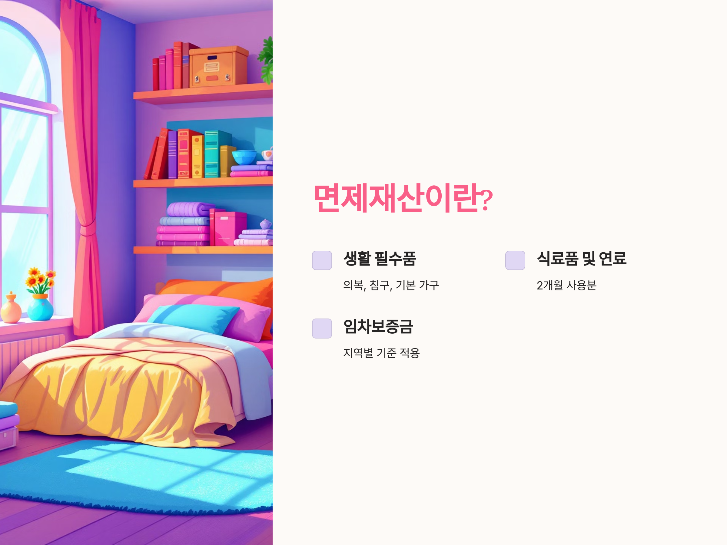 - 미성년 자녀를 둔 한부모: 자녀 양육비와 교육비를 면제재산으로 인정.