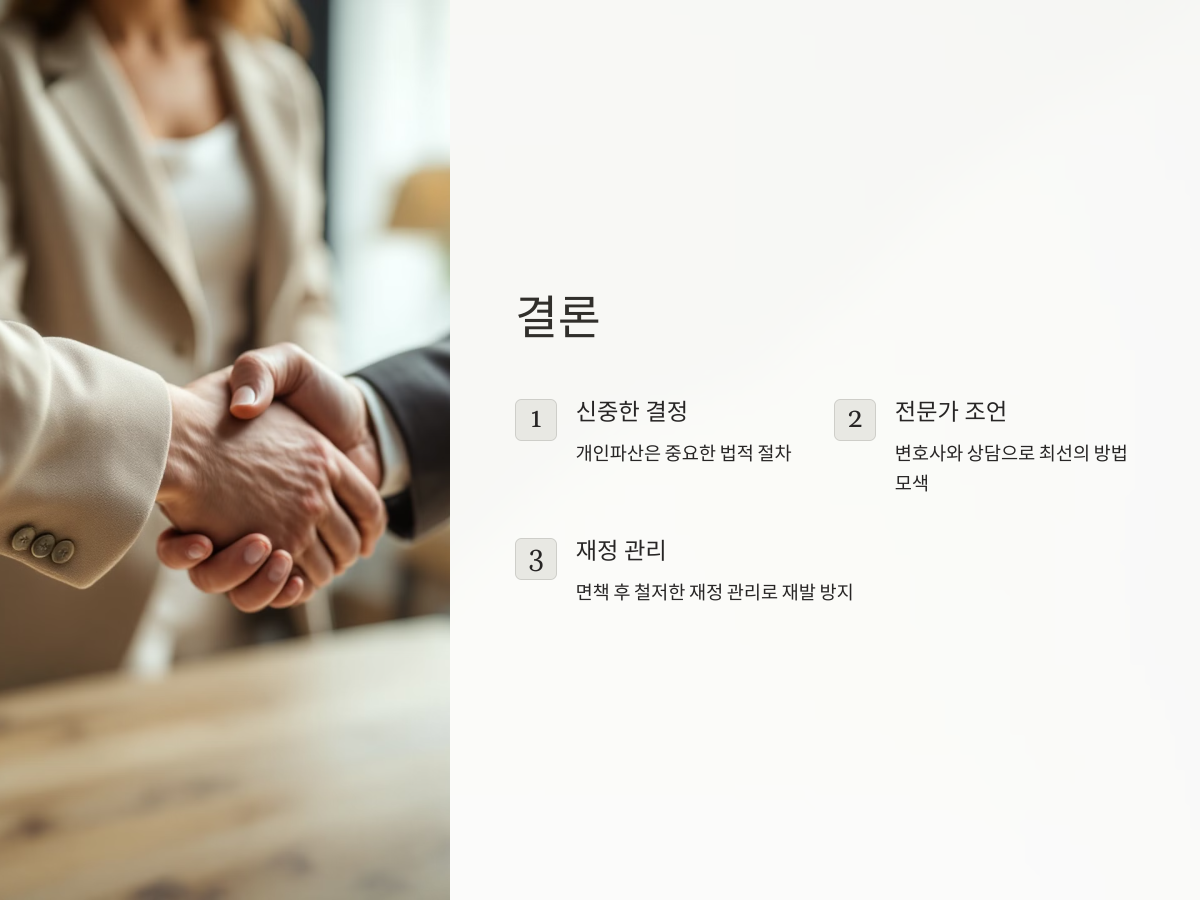 - 파산 선고 및 면책 결정: 법원의 판단에 따라 채무 일부 또는 전부가 면제됩니다.
