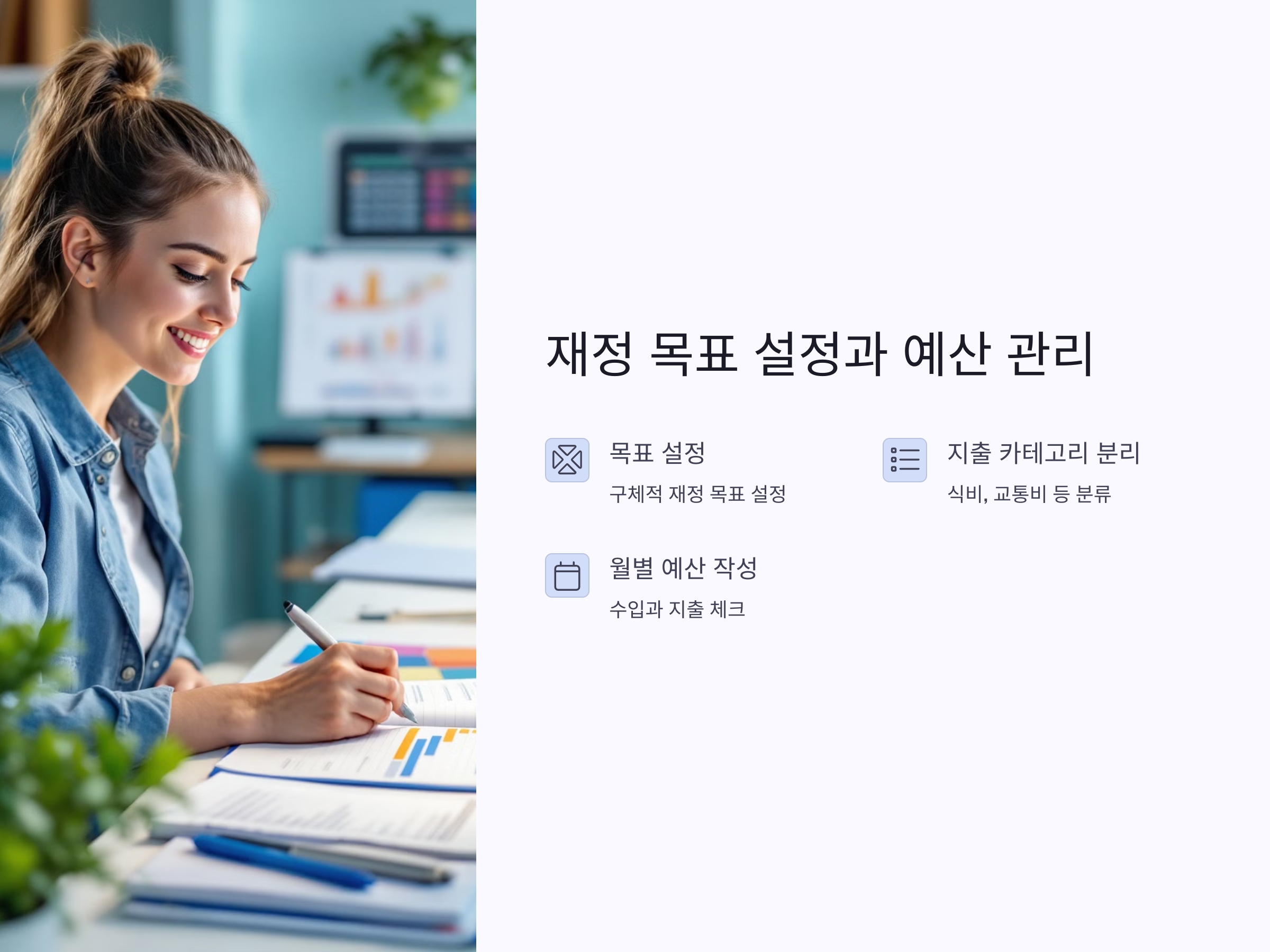 - 목표 설정: 재정 목표를 구체적으로 설정하세요. 예를 들어, 월급의 일정 비율을 저축하거나, 지출을 20% 줄이겠다고 목표를 정할 수 있습니다. 이 목표를 달성하기 위해 계획을 세우세요.