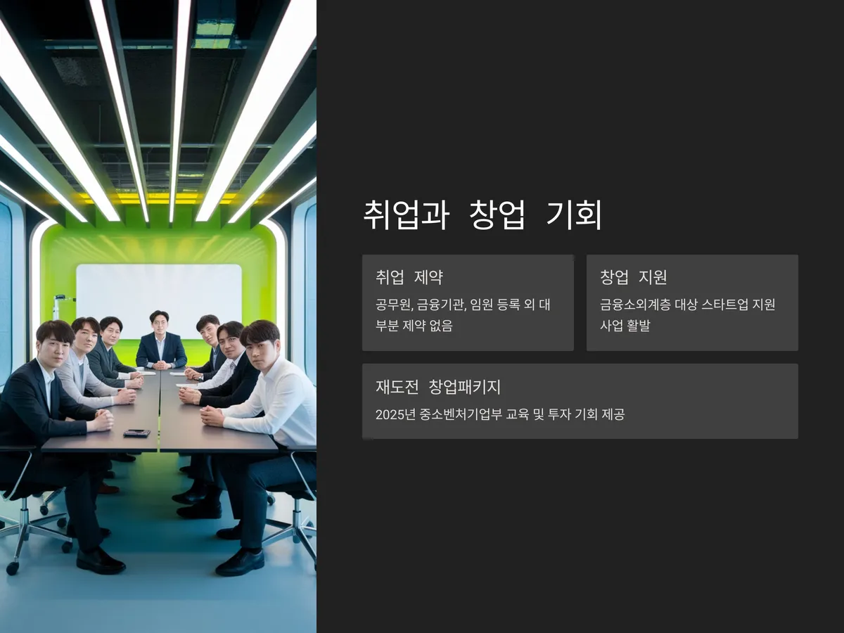 개인파산 이후 가장 걱정하는 것 중 하나는 취업 또는 창업에 불이익이 있는지입니다. 면책 이후 1년이 지난 시점에서는 공무원 채용, 금융기관 취업, 임원 등록 등 특정 직종을 제외하고는 대부분 제약이 없습니다. 오히려 최근에는 금융소외계층을 대상으로 하는 스타트업 창업 지원사업이 활발하게 진행되고 있어, 면책자들에게 새로운 기회를 제공합니다.