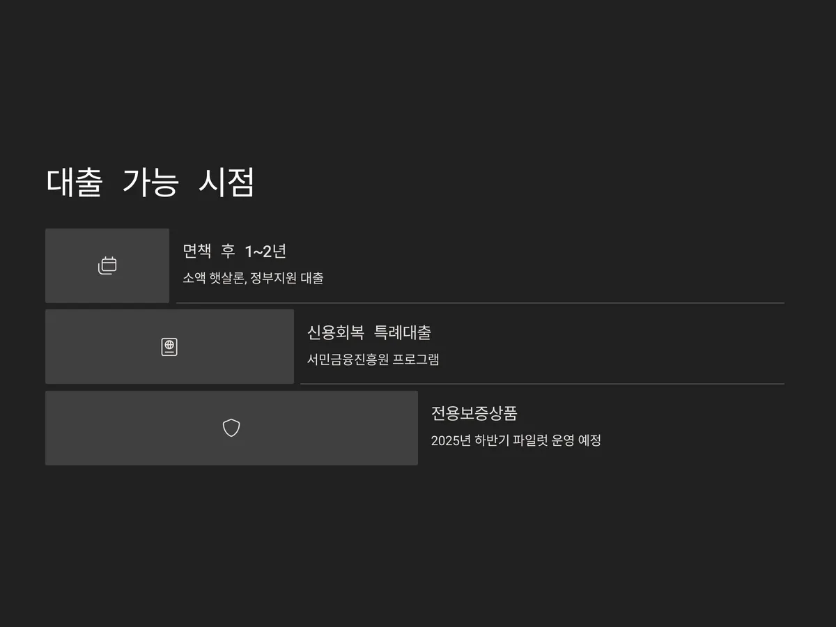 개인파산 면책자도 일정 시간이 지나고 신용이 회복되면 대출을 받을 수 있습니다. 특히 면책 후 1년~2년 사이에는 소액 햇살론이나 정부지원 대출을 통해 신용 이력을 다시 쌓는 것이 중요합니다. 최근에는 서민금융진흥원에서 ‘신용회복 특례대출’ 프로그램을 운영하며, 면책자에게 특화된 대출 상품을 제공합니다.