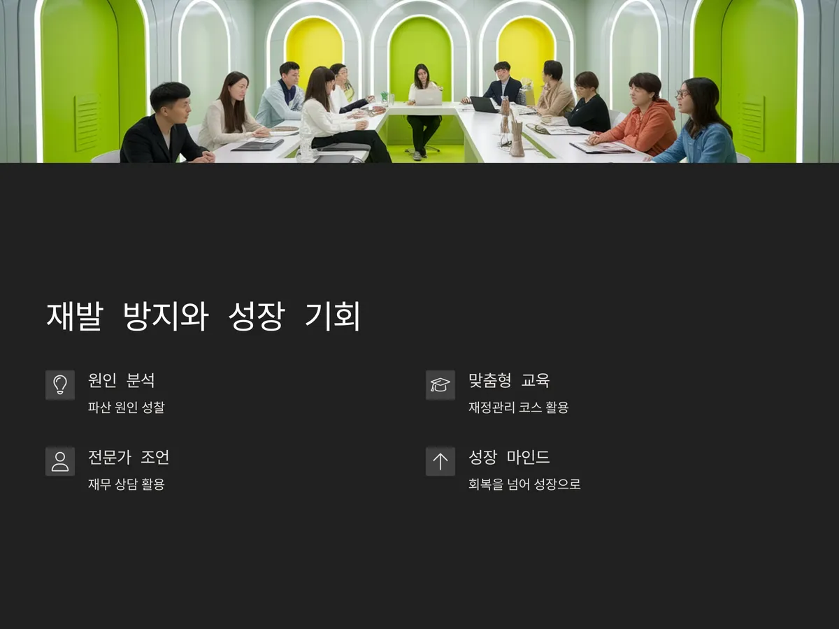 무엇보다 중요한 건 ‘재발 방지’입니다. 자신이 어떤 이유로 파산에 이르게 되었는지 성찰하고, 그 원인을 정확히 분석해야 다시 같은 상황에 빠지지 않습니다. 전문가의 조언을 받으며 재무 목표를 설정하고, 장기적으로는 소득 증대 방안을 함께 고민해보는 것이 필요합니다.