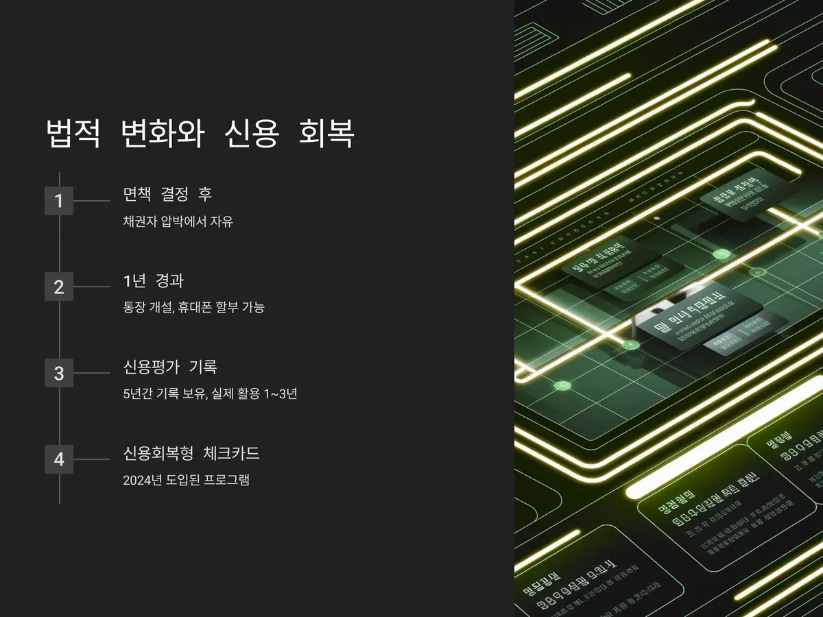 1년이 지난 시점부터는 통장 개설, 휴대폰 할부, 교통카드 후불 등의 일상적 금융 활동은 대부분 가능해지며, 소액 신용카드 발급도 일부 은행에서 조건부로 재개가 가능합니다. 또한, 2024년 도입된 '신용회복형 체크카드 프로그램'은 면책자들에게 큰 도움이 되고 있습니다.