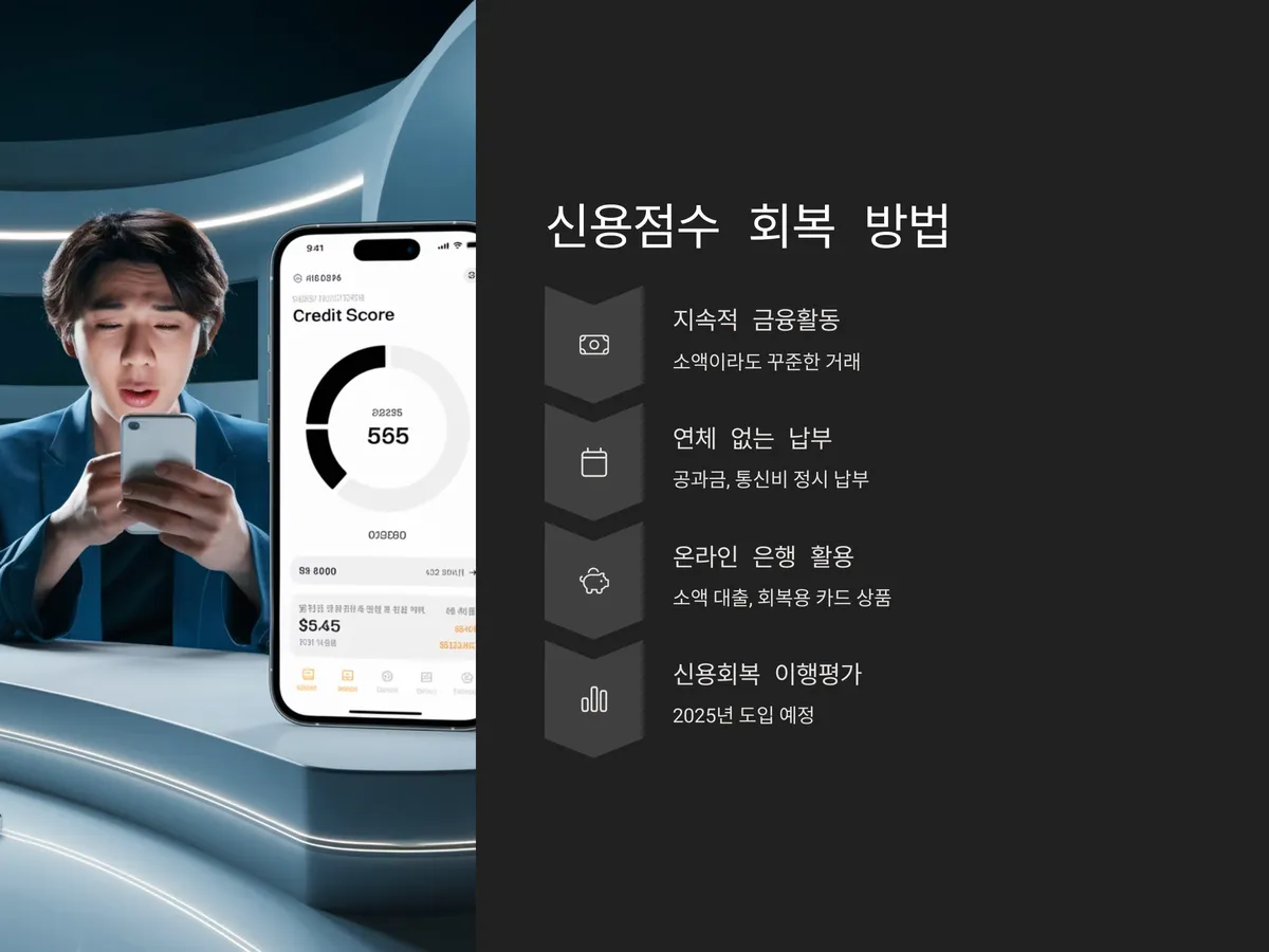 신용점수 회복의 핵심은 '지속적인 금융활동'입니다. 소액이라도 꾸준히 금융거래를 하고, 각종 공과금이나 통신비를 연체 없이 납부하는 것이 가장 중요합니다. 특히, '케이뱅크'나 '토스뱅크' 등 온라인 은행에서 제공하는 소액 대출 및 회복용 카드 상품은 신용 회복 초기 단계에 유용하게 활용될 수 있습니다.