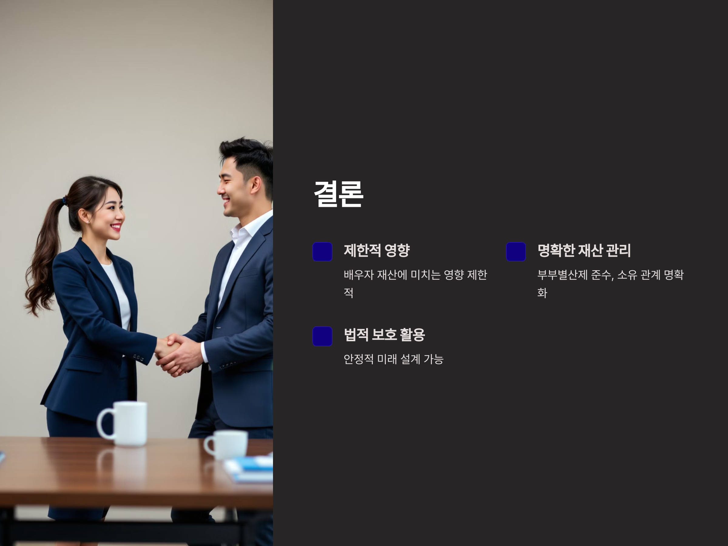 - 재산 분리 계약: 부부별산제를 강화하기 위해 재산 분리 계약을 체결하는 것도 고려해볼 만합니다.