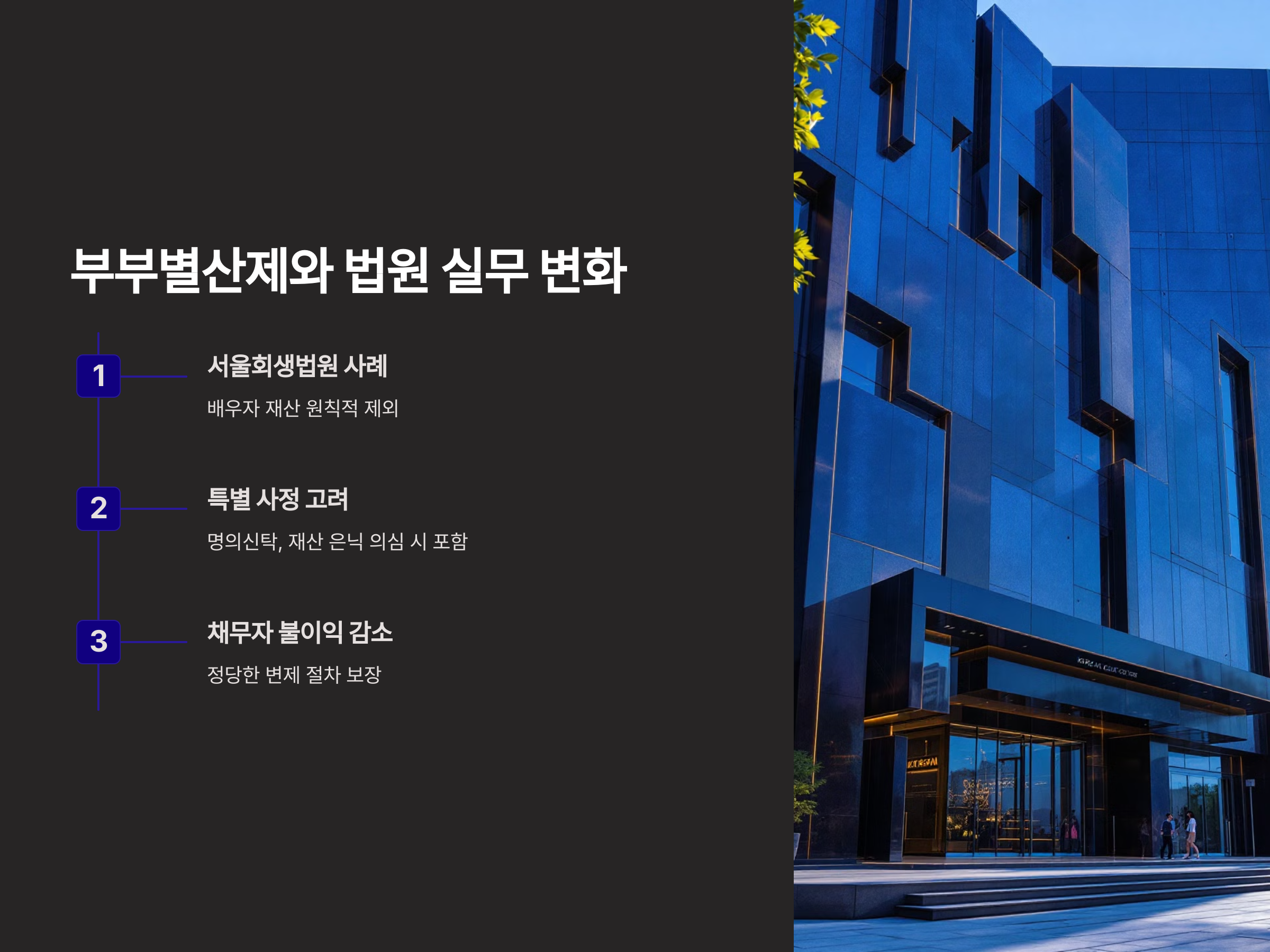 - 서울회생법원 사례: 배우자 재산을 원칙적으로 채무자의 채무 변제 대상에서 제외합니다.