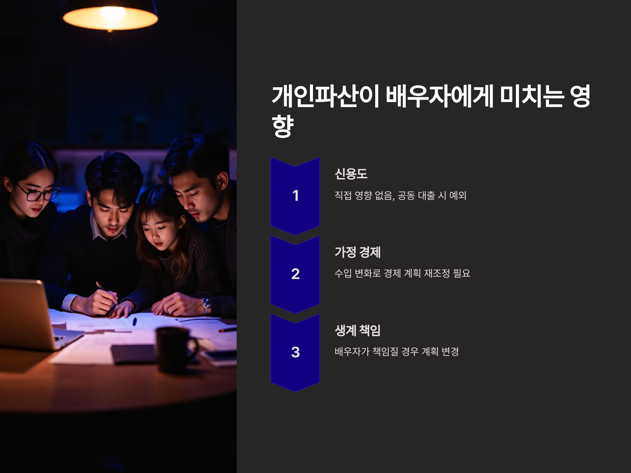 - 가정 경제 변화: 채무자의 파산으로 가계 수입에 변화가 생길 수 있으므로 배우자와 충분한 상의가 필요합니다.