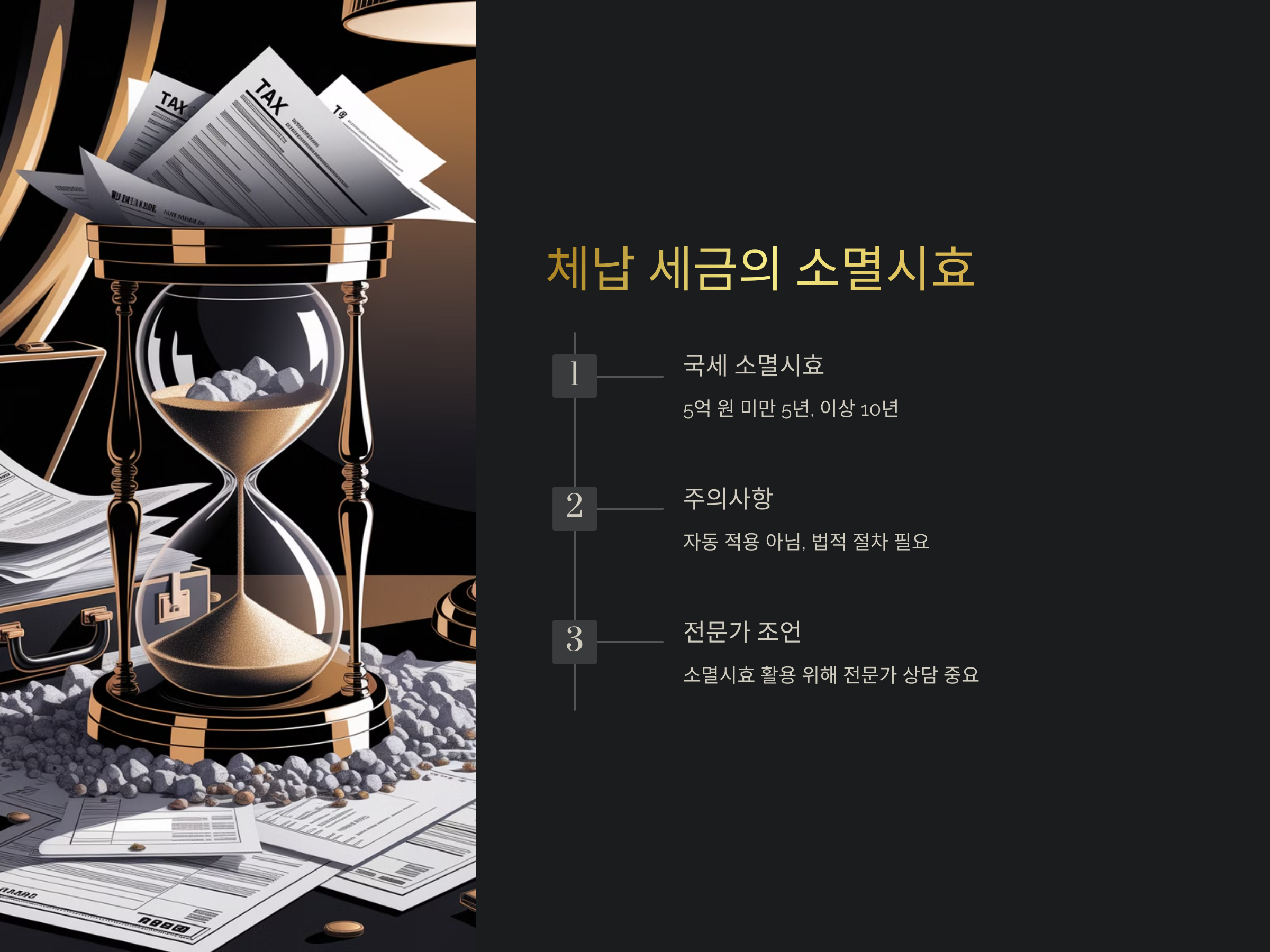 세금 채무에도 소멸시효가 존재합니다. 국세의 경우, 5억 원 미만은 5년, 5억 원 이상은 10년의 소멸시효 기간이 적용됩니다. 그러나 소멸시효는 단순히 시간이 지났다고 해서 자동으로 적용되는 것이 아니며, 법적 절차를 통해 인정받아야 합니다. 따라서 소멸시효를 활용하고자 한다면 전문가의 도움을 받는 것이 중요합니다.