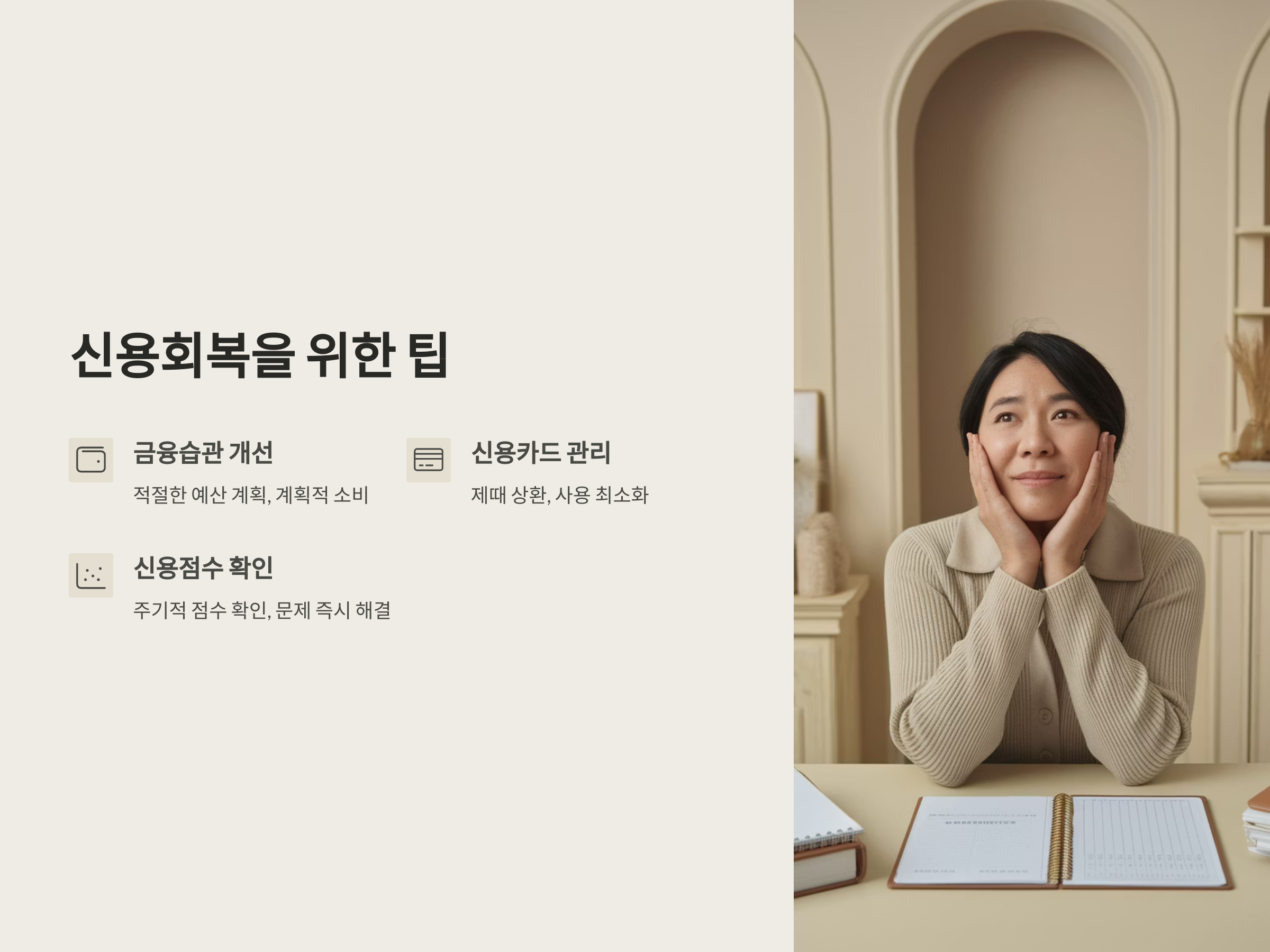 - 신용카드와 대출 관리: 신용카드를 사용하고, 대출을 받을 때는 반드시 제때에 상환을 해야 합니다. 상환 이력을 잘 관리하면 신용 회복에 도움이 됩니다.
