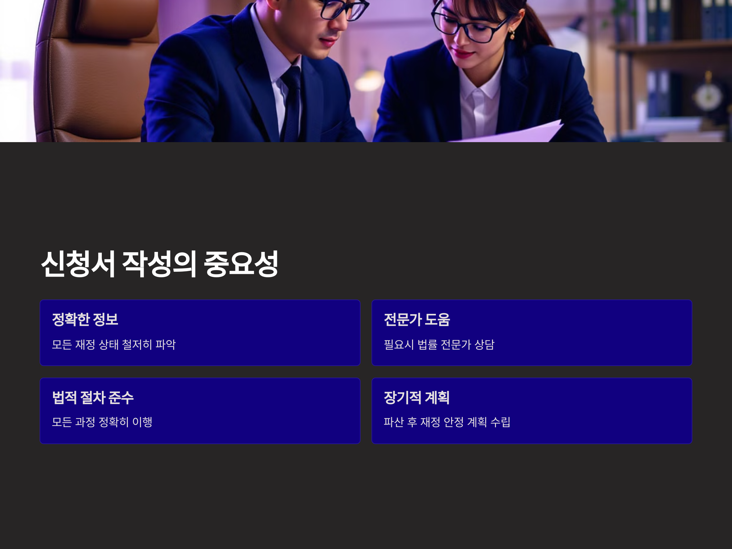 이 외에도 신청서 작성 시 중요한 점은 과거에 파산이나 회생 절차를 거친 사실이 있다면 이를 정확히 기재해야 하며, 현재의 재정 상황을 그대로 반영하는 것입니다.