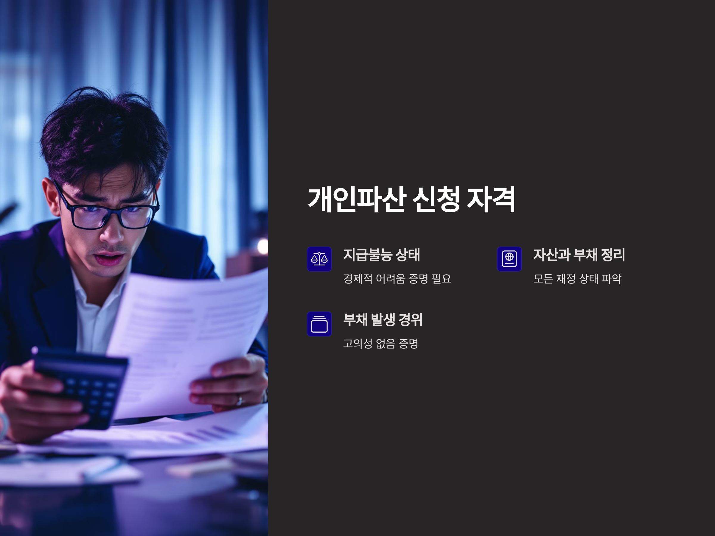 개인파산을 신청하려면 몇 가지 자격 조건이 있습니다. 경제적으로 어려움을 겪고 있거나, 지급불능 상태에 있는 경우에만 개인파산을 신청할 수 있습니다. 이를 위해서는 먼저 본인의 재정 상태를 정확하게 파악해야 합니다.