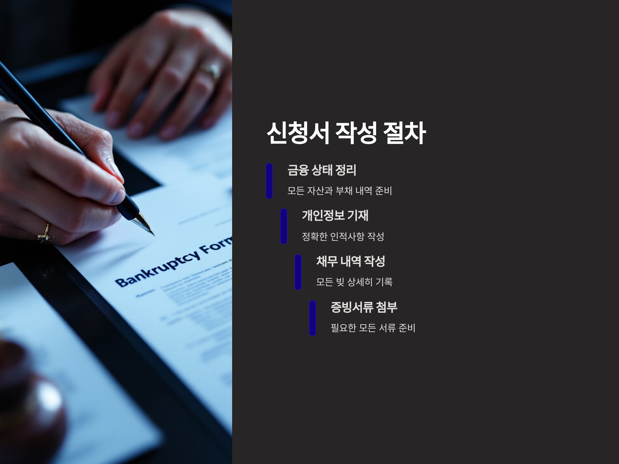 신청서에는 본인의 개인정보, 채무 내역, 자산 내역 등을 기재해야 하며, 채무자 본인이 제공한 정보가 사실임을 증명할 수 있는 서류들이 함께 제출되어야 합니다. 이때, 자산 내역을 정확하게 기재하고, 과거의 금융 거래 내역도 상세히 기록하는 것이 중요합니다. 또한, 법원에서 요구하는 증빙서류를 빠짐없이 제출해야 합니다.