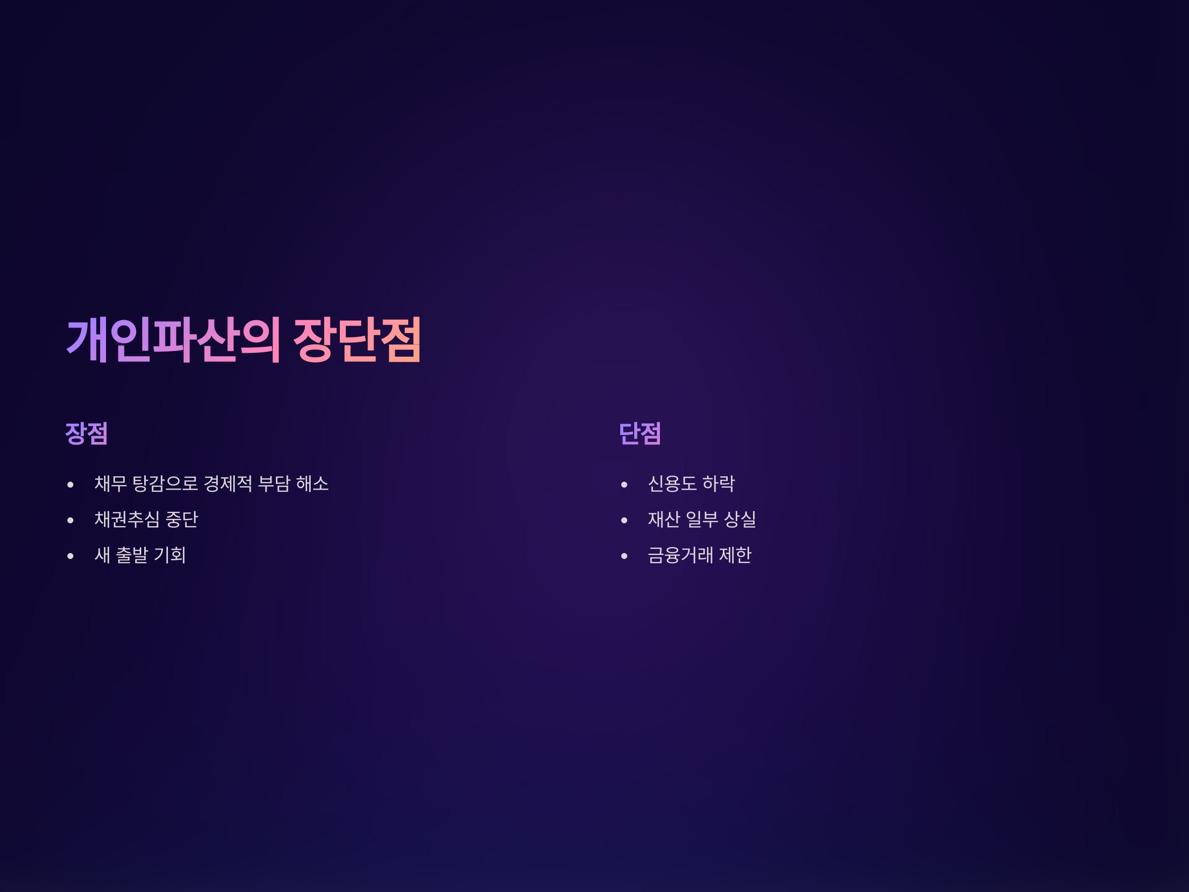 개인파산은 최후의 재정적 해결책으로, 법적 절차에 따라 채무를 탕감받을 수 있는 중요한 수단입니다. 하지만 이를 신청하기 전에 자격 요건과 절차를 충분히 이해하고, 자신의 상황에 맞는지 판단해야 합니다. 개인파산은 신중하게 결정해야 하는 문제이므로, 전문가의 조언을 받는 것이 좋습니다.