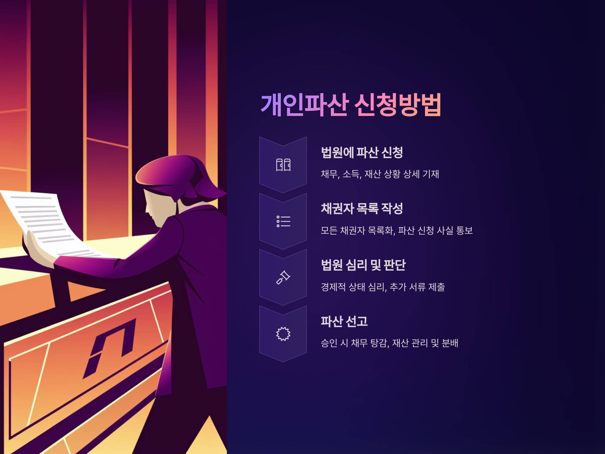 개인파산을 신청하는 절차는 단계별로 진행됩니다. 각 단계에서는 필요한 서류 제출과 법적 절차를 따라야 하므로 신중히 진행해야 합니다. 개인파산 신청을 위한 일반적인 과정은 다음과 같습니다: