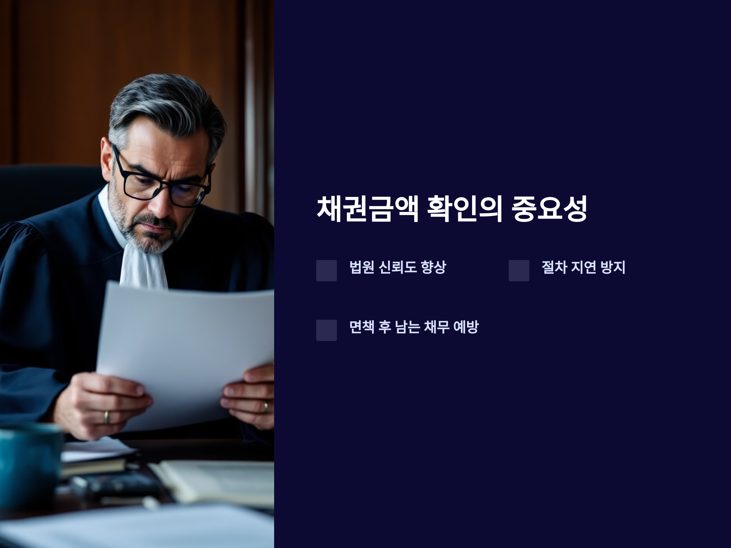 채권금액을 확인하는 것은 개인파산 절차에서 필수적인 단계입니다. 채권목록이 불완전하거나 금액이 부정확하면 법원이 면책 결정을 내리기 어려워질 수 있습니다. 또한, 제대로 준비된 서류는 절차를 더 원활하게 진행하도록 도와줍니다.