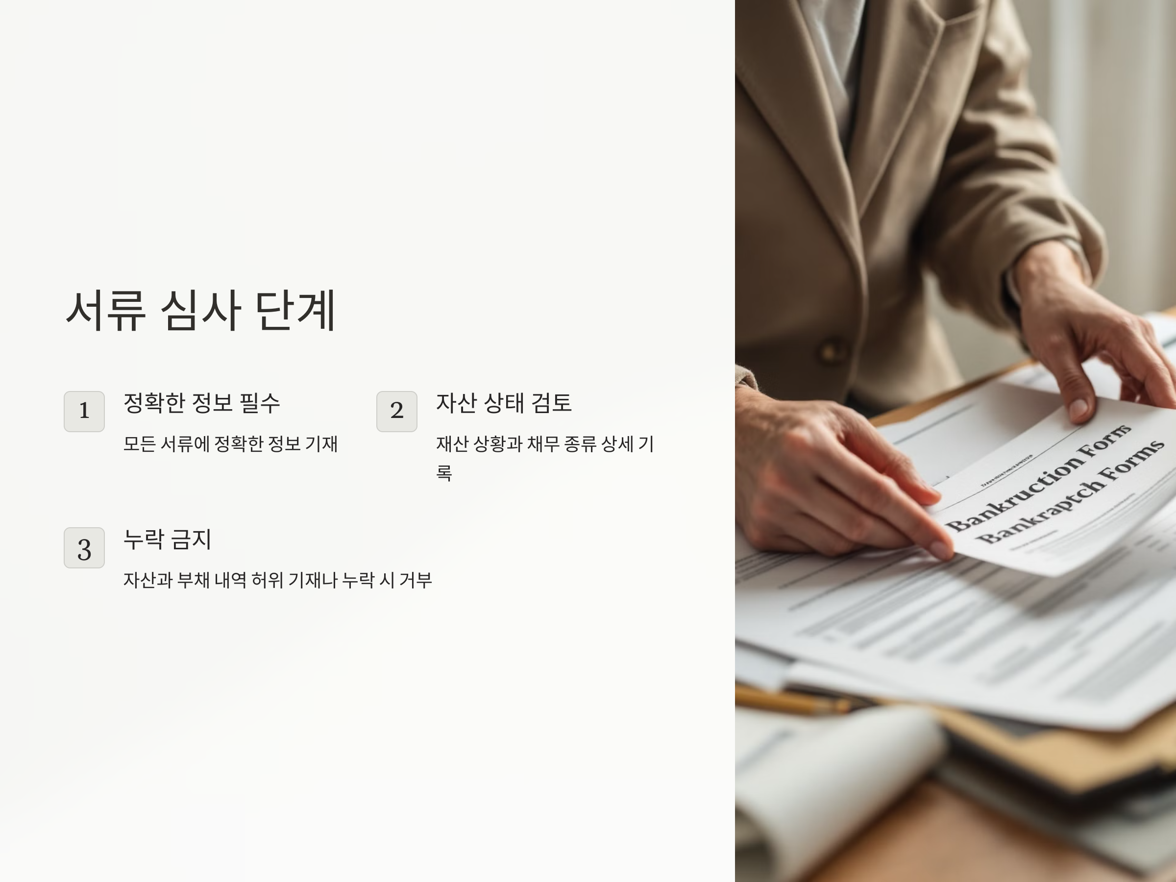 서류 심사에서 중요한 점은, 모든 정보가 정확하게 기재되어 있어야 한다는 것입니다. 특히, 자산과 부채 내역을 허위로 기재하거나 일부러 누락하면, 법원에서 심사를 거부하거나 심사 과정이 지연될 수 있습니다. 따라서, 법원에 제출하기 전에 모든 서류가 정확하고 완전한지 반드시 확인해야 합니다.