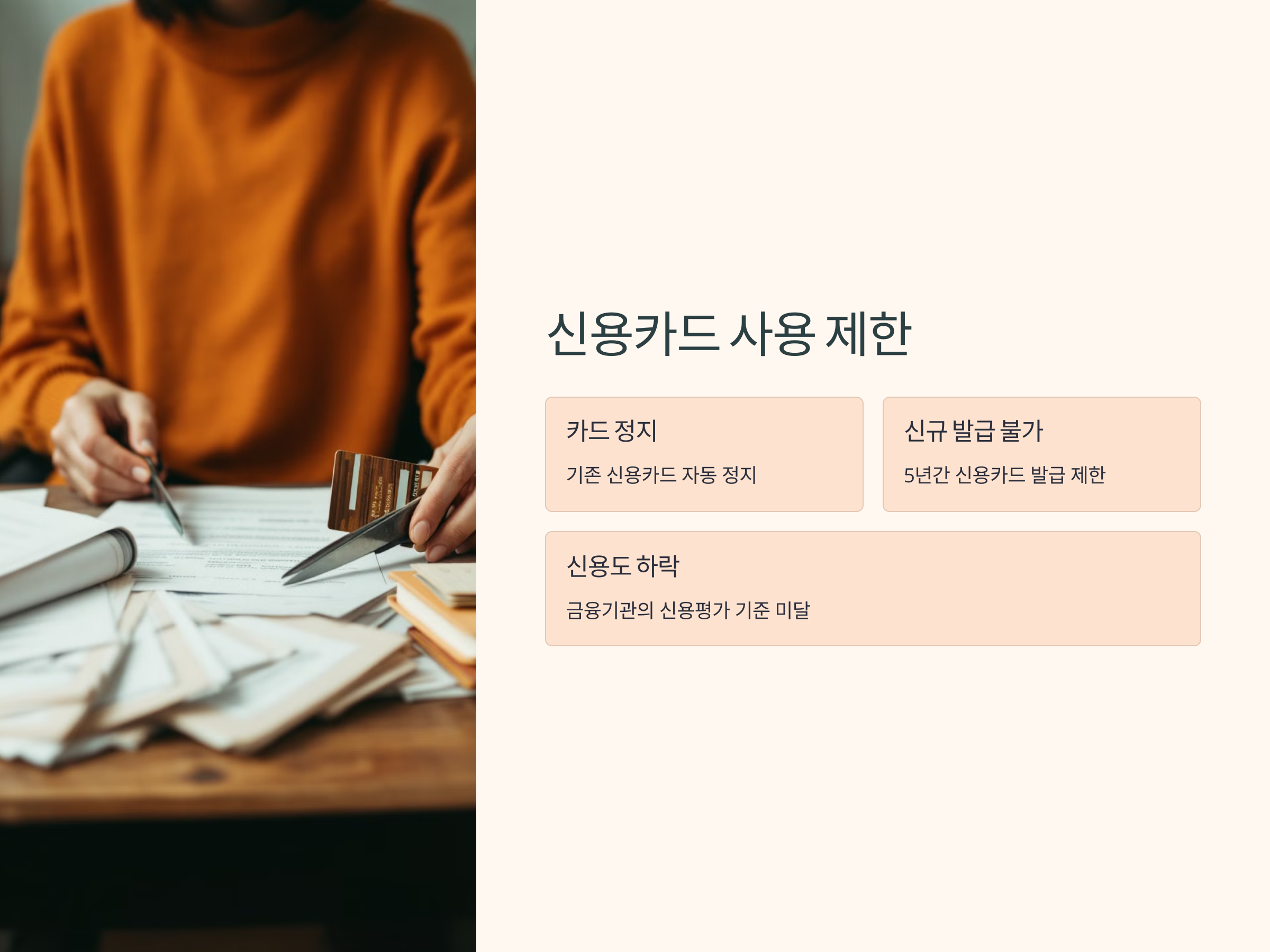 개인파산 신청 후 가장 큰 영향을 받는 부분 중 하나는 신용카드 사용입니다. 파산 신청이 승인되면 기존의 신용카드는 대부분 자동으로 정지되며, 새로운 신용카드를 발급받는 것도 매우 어려워집니다. 금융기관은 개인파산 기록을 바탕으로 신용도를 평가하기 때문에, 파산 신청 후에는 신용카드를 발급받거나 사용하기 어려운 상황이 됩니다. 특히 5년간은 신용카드 발급이 제한될 수 있습니다.
