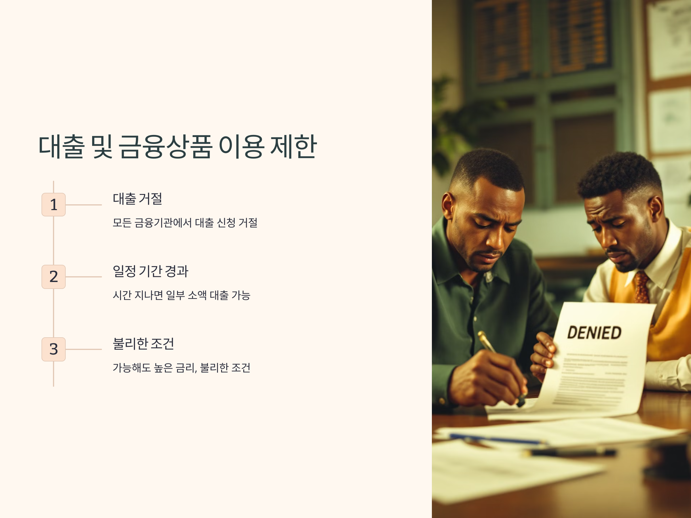 파산 후에는 대출을 받거나 금융상품을 이용하는 데에도 제한이 생깁니다. 은행과 같은 금융기관은 파산 기록을 바탕으로 대출 신청자의 신용을 평가하므로, 파산 신청자가 대출을 신청할 경우 거의 모든 금융기관에서 대출을 거절합니다. 만약 대출이 필요하다면, 개인파산 이후 일정 기간이 지나야만 대출이 가능해지며, 그마저도 금리가 높거나 조건이 불리할 수 있습니다.
