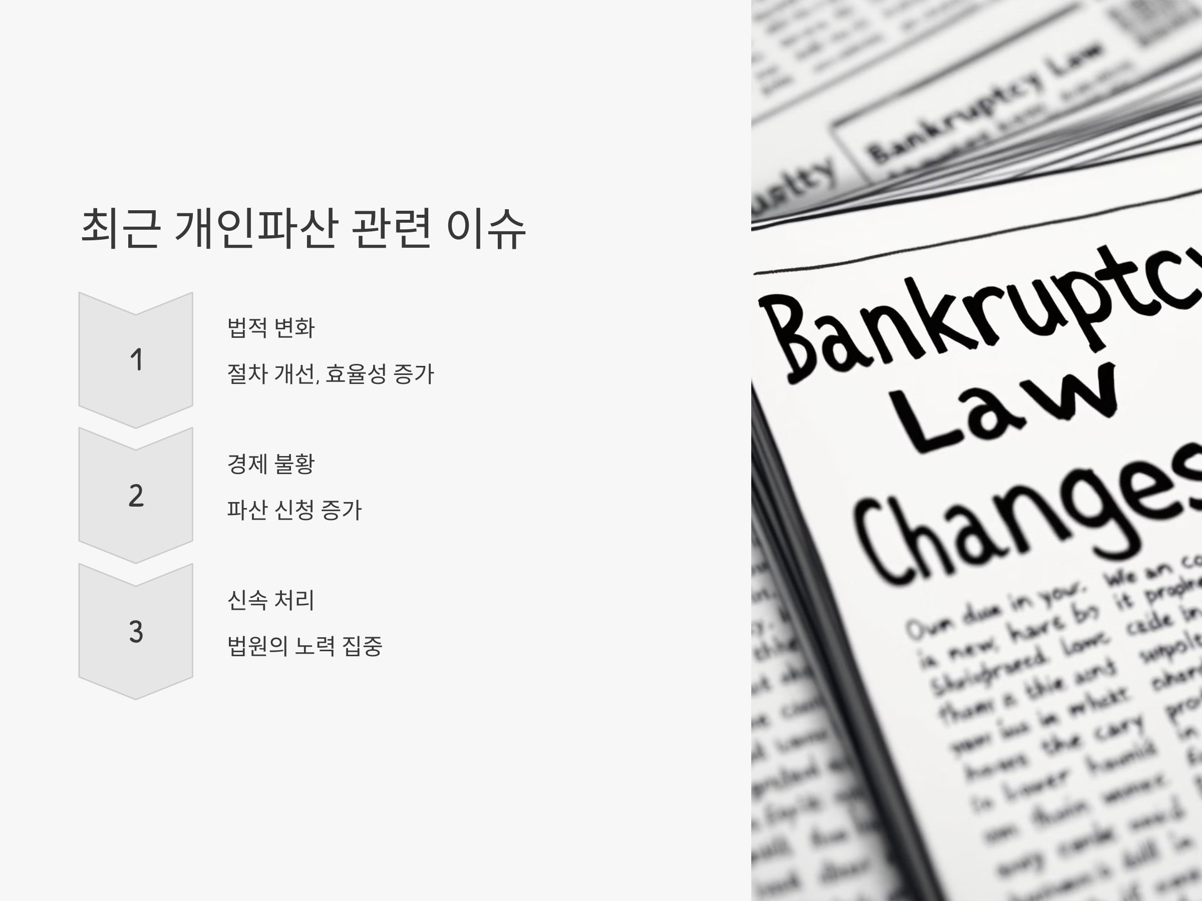 최근 몇 년간 개인파산과 관련된 법적 변화가 있었습니다. 특히, 개인파산 신청 후 압류 해제와 관련된 법적 절차가 보다 명확하고 효율적으로 개선되었으며, 많은 사람들이 이를 통해 채무에서 벗어나고 있습니다.