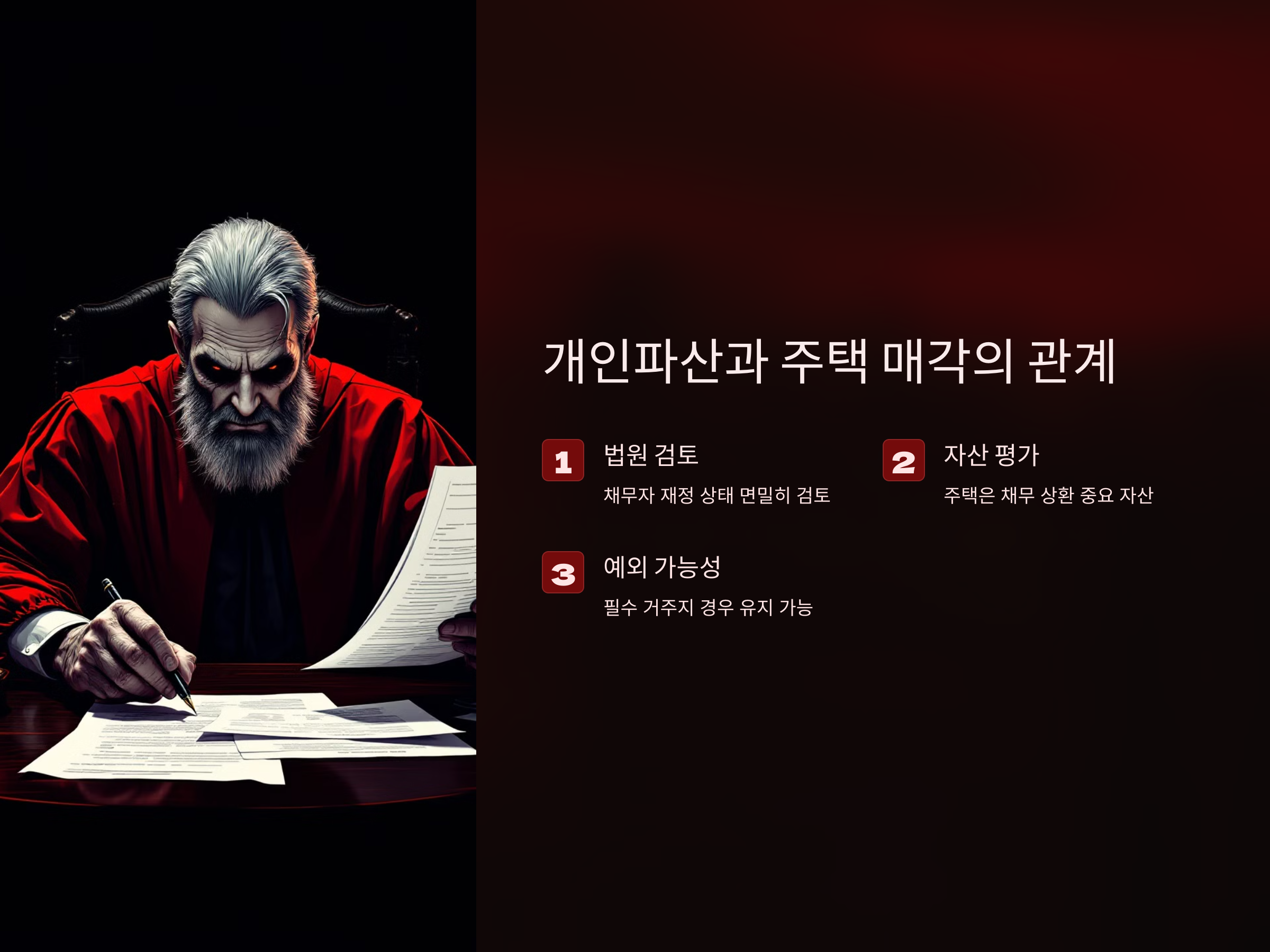 또한, 주택을 유지할 수 있는 조건 중 하나는 "최저 생계비 보장"입니다. 즉, 주택이 채무자의 기본적인 생활을 유지하는 데 필요한 최소한의 자산으로 인정받을 경우, 주택 매각을 면할 수 있는 경우가 있습니다. 법원은 채무자의 생활 여건을 고려해 결정을 내리므로, 주택이 채무자의 생계에 필수적인 자산이라면 이를 보호하려고 할 수 있습니다.