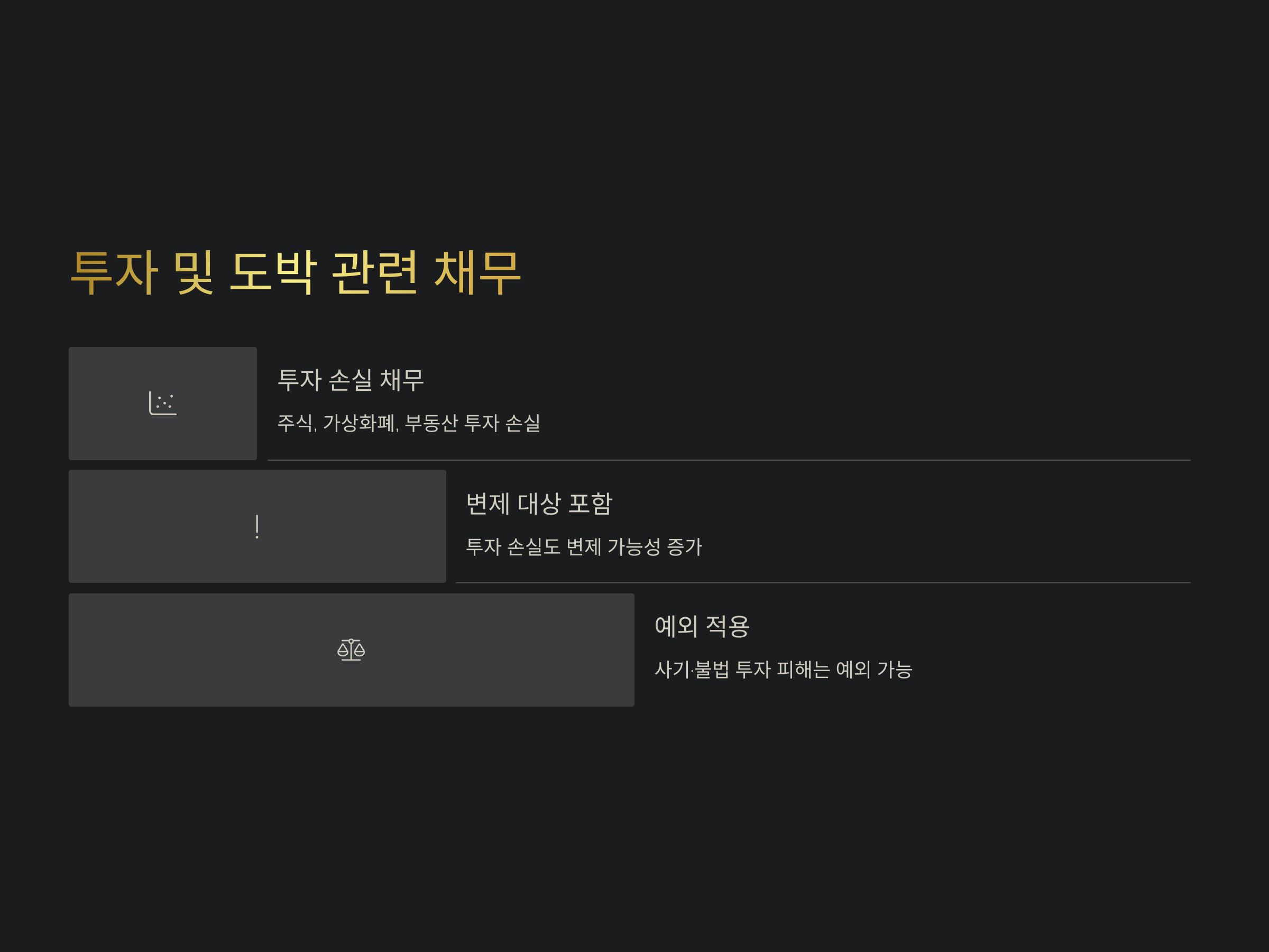주식, 가상화폐, 부동산 투자로 인한 채무도 변제 대상에 포함될 가능성이 커졌습니다. 다만, 사기나 불법 투자 피해자의 경우 예외가 적용될 수 있으므로, 법률 전문가와의 상담을 통해 전략을 세우는 것이 중요합니다. citeturn0search0