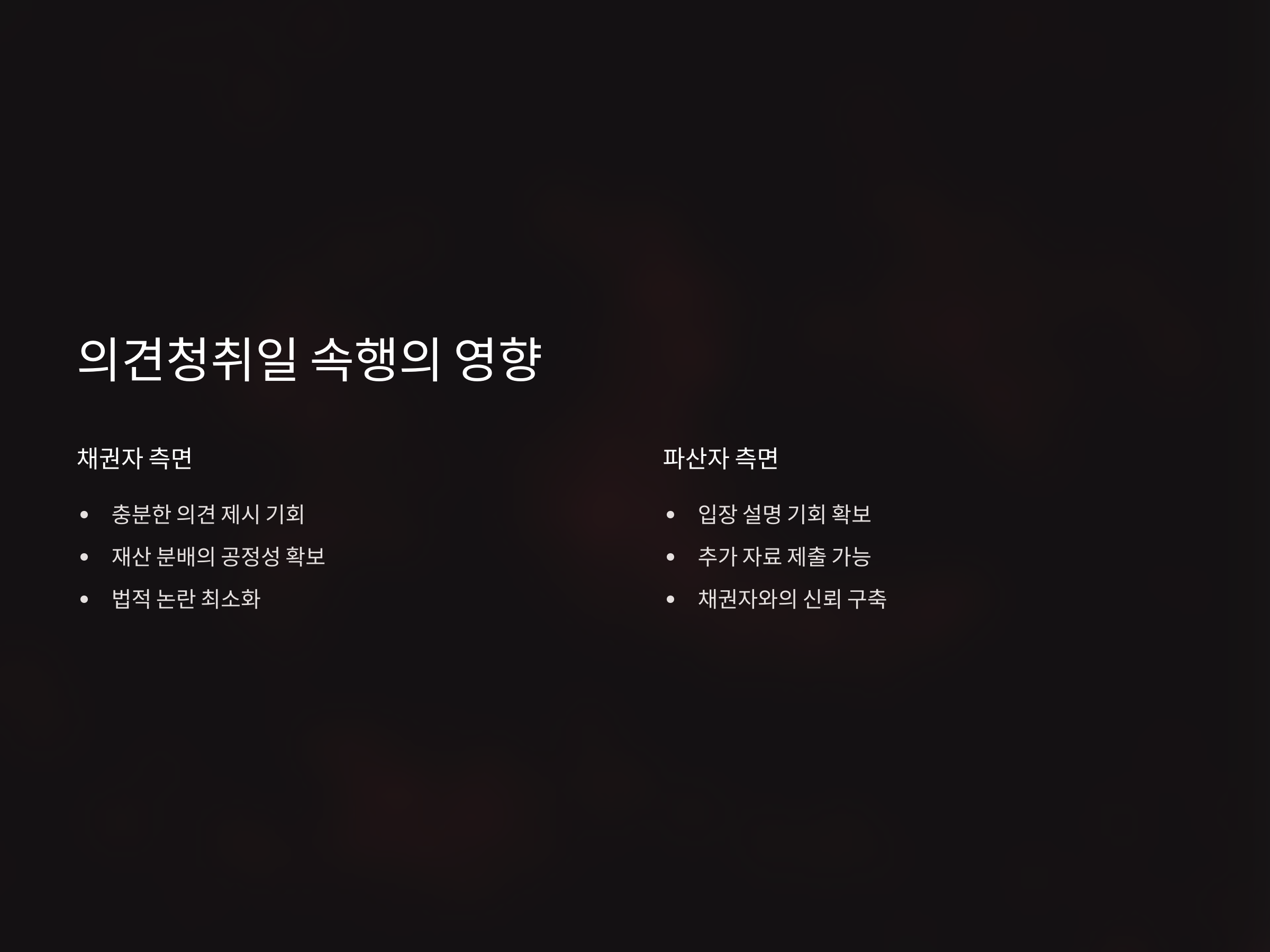 또한, 속행되는 의견청취일은 파산자에게도 중요한 기회를 제공합니다. 추가적인 시간을 확보함으로써 파산자는 자신의 입장을 더욱 명확하게 설명하고, 채권자들의 이해를 돕기 위한 자료를 제출할 수 있습니다. 이러한 과정은 채권자와 파산자 간의 신뢰를 구축하는 데 중요한 역할을 합니다.