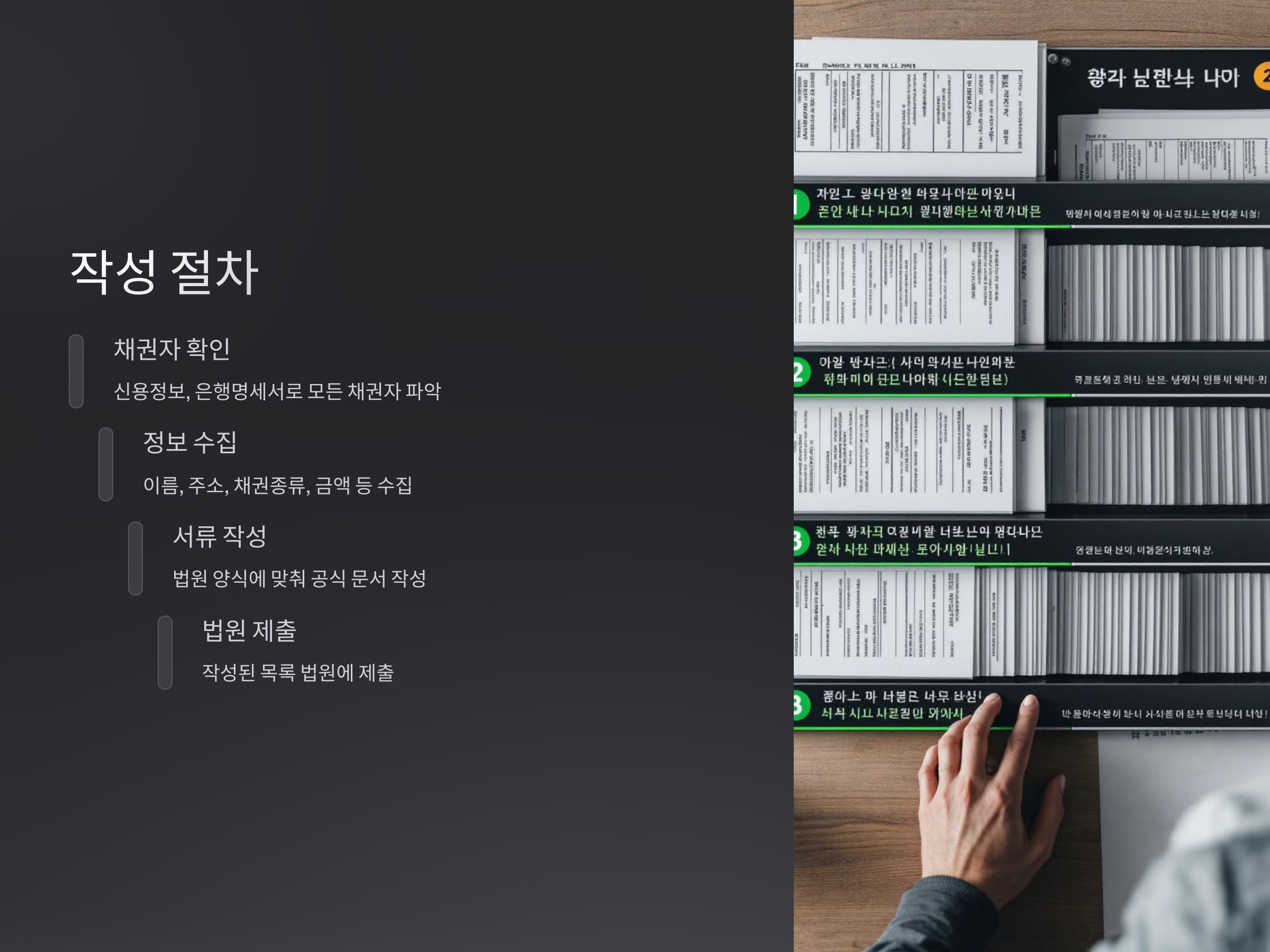 채권자 목록 작성 절차는 다음과 같은 단계로 진행됩니다: