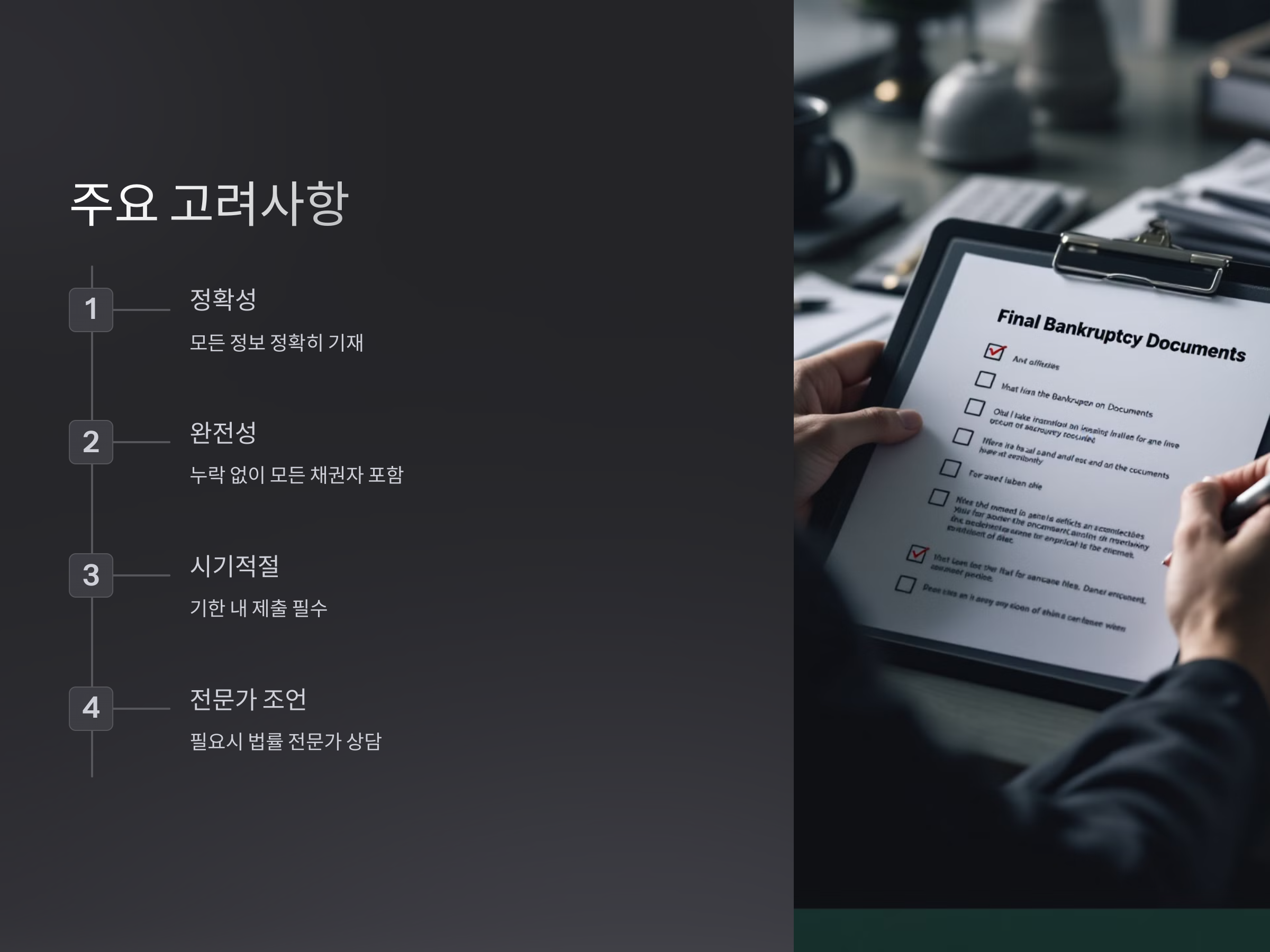 이 정보들이 정확하게 작성되지 않으면, 파산 절차가 지연될 수 있으며 법적 문제가 발생할 위험이 있습니다.
