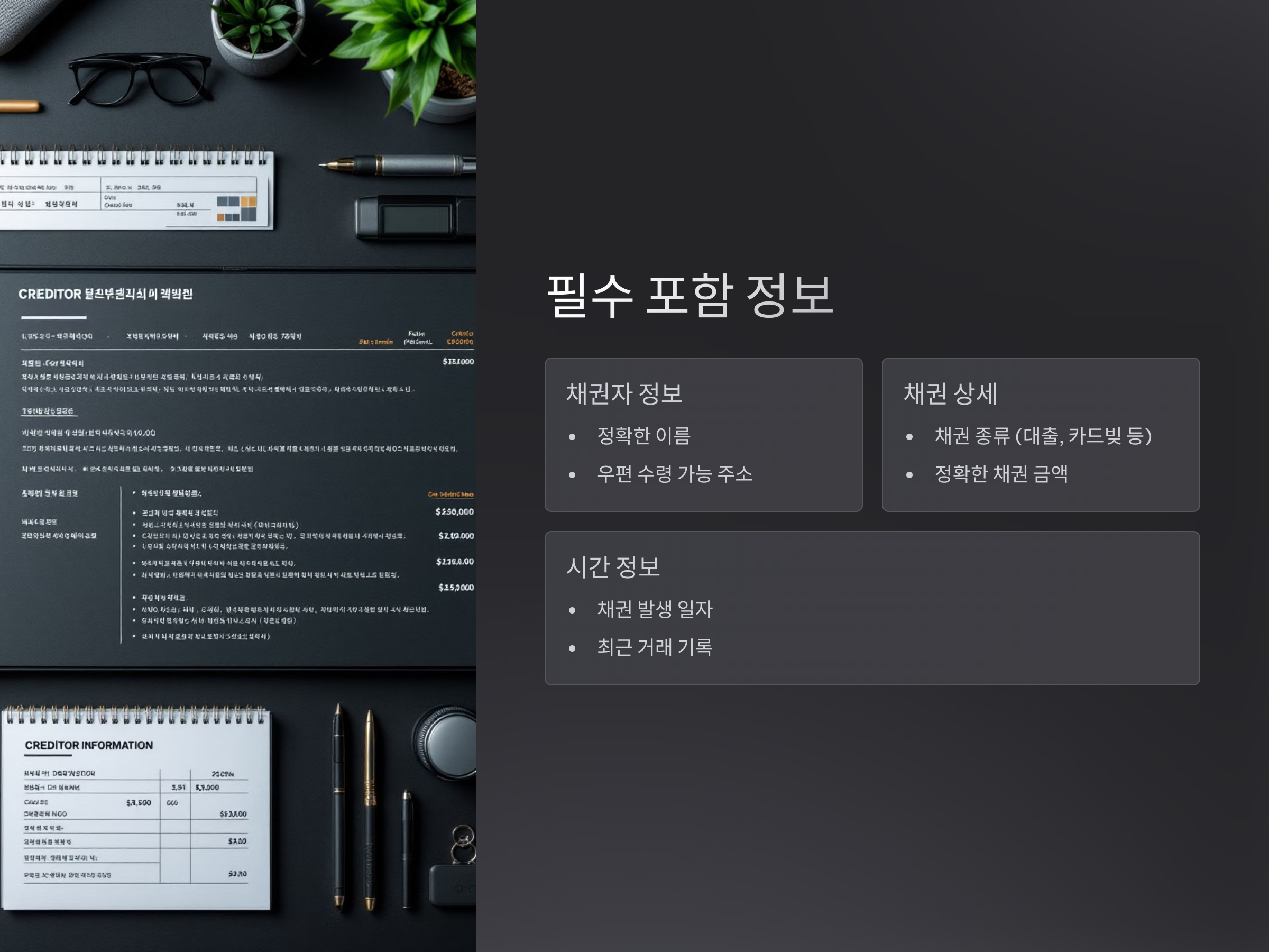 - 채권 종류: 빚이 어떤 종류인지, 예를 들어 대출, 카드빚, 담보대출 등의 정보를 명확히 해야 합니다.
