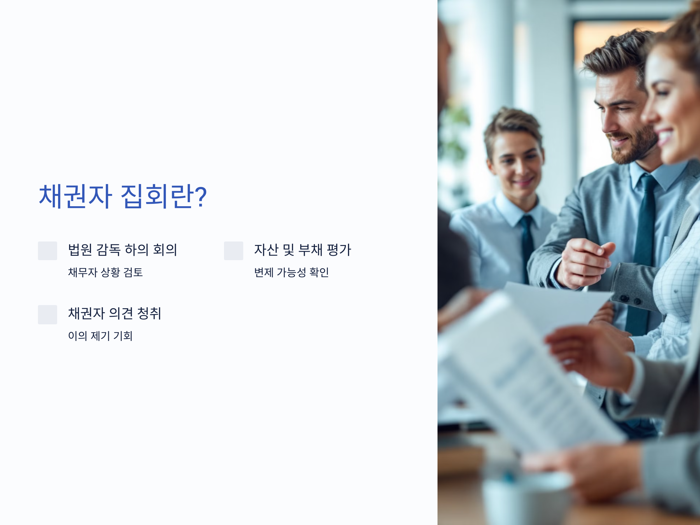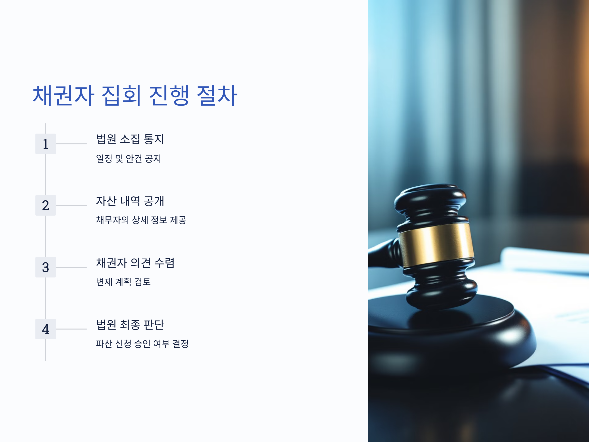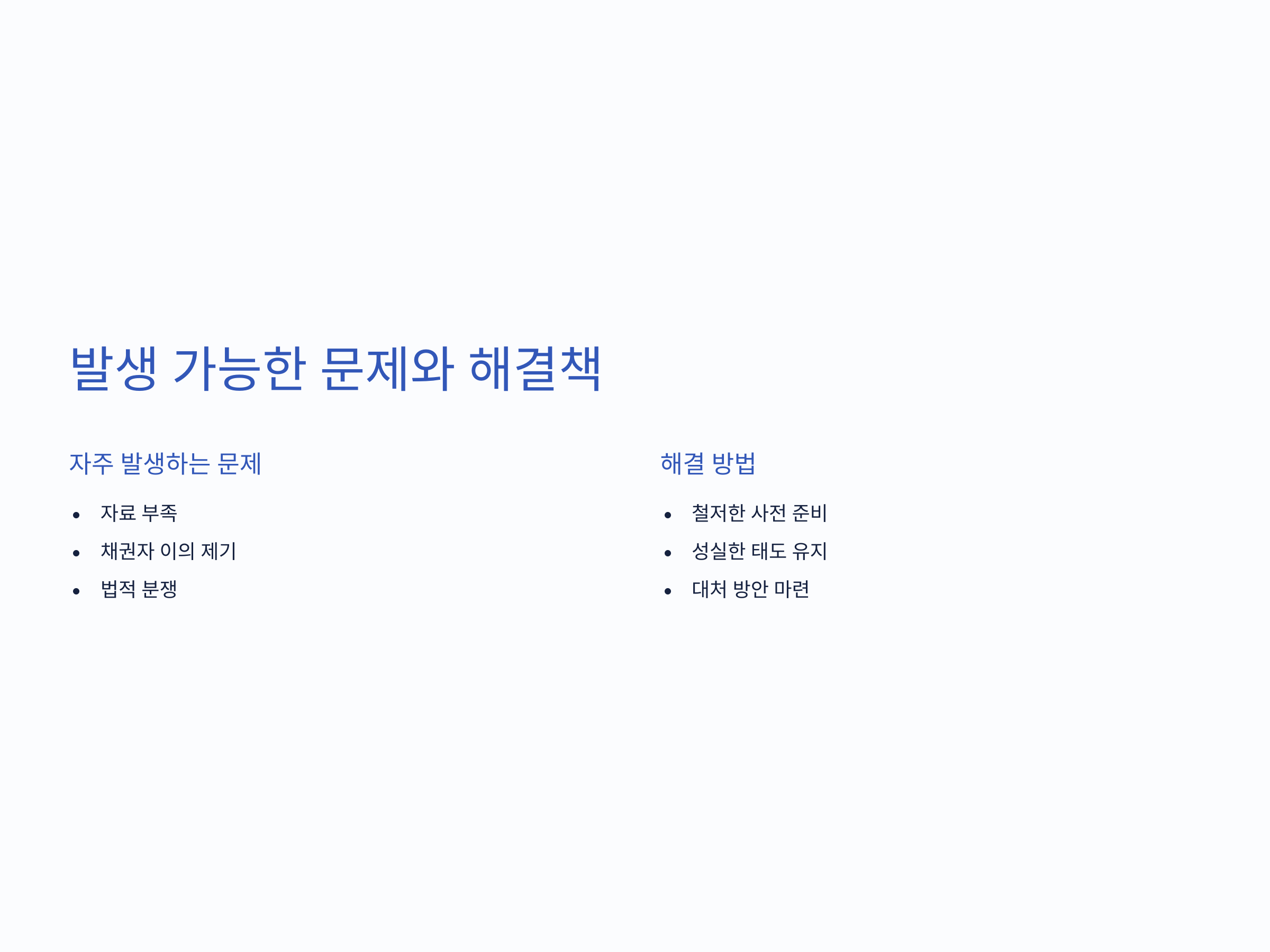 - 채권자의 의견 청취: 채권자들이 법원에 의사를 전달할 기회를 제공합니다.